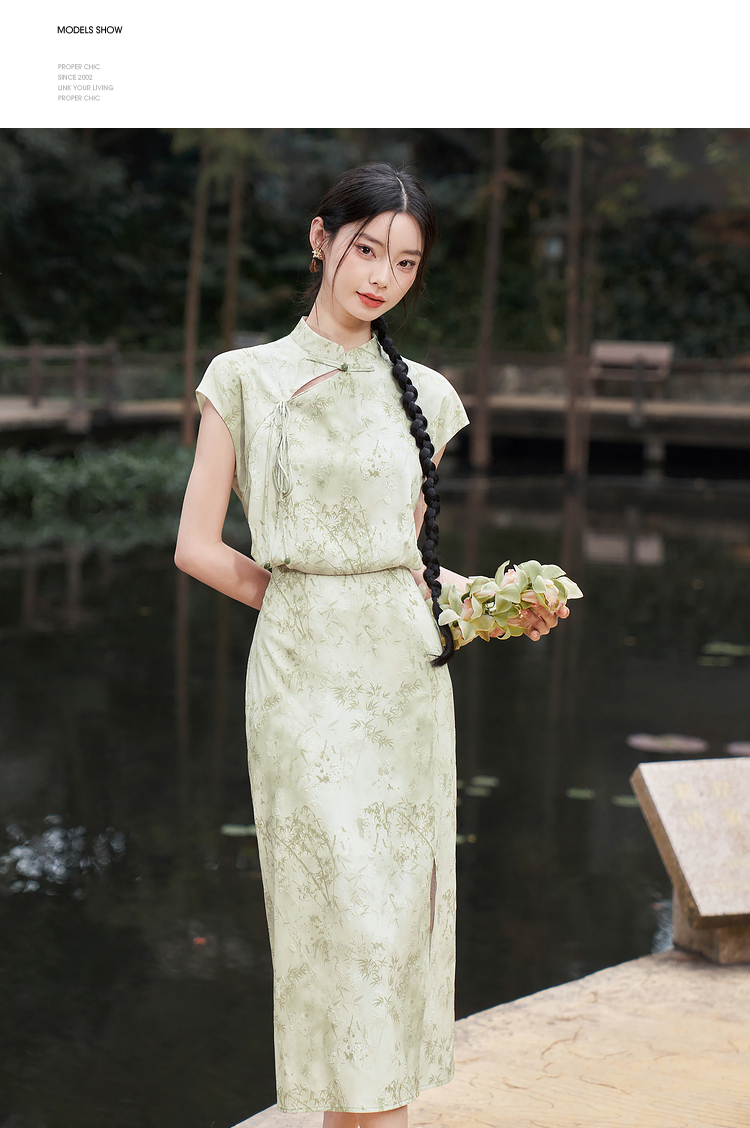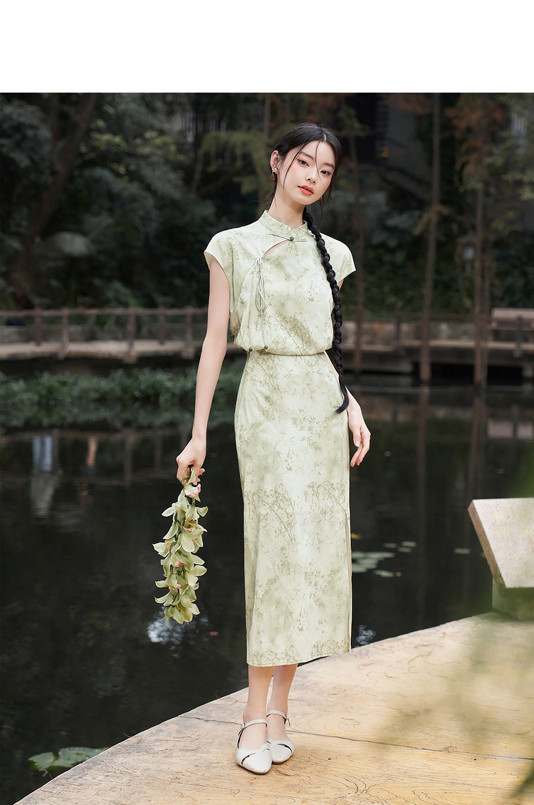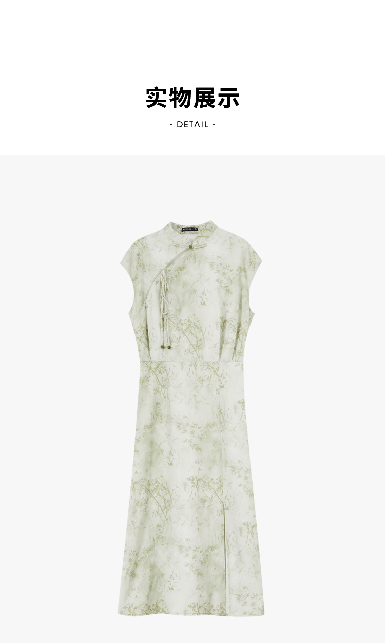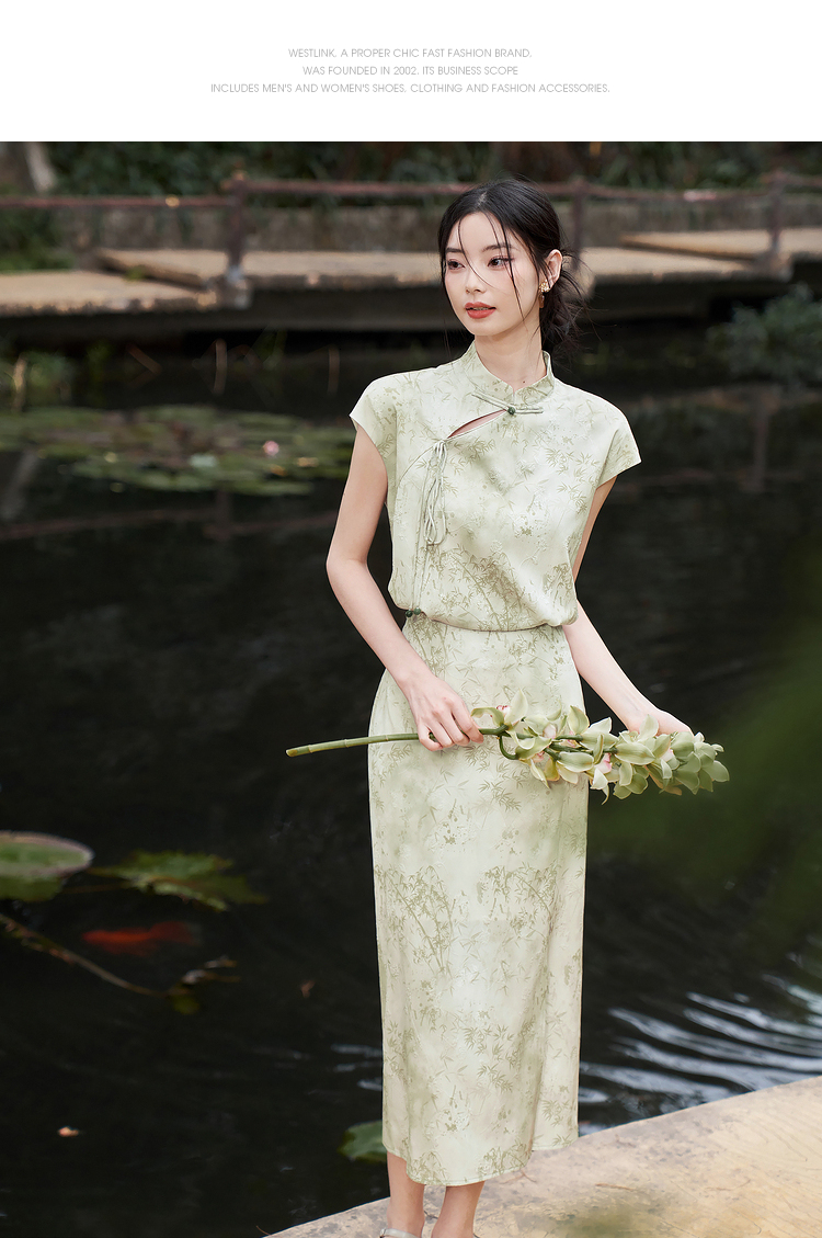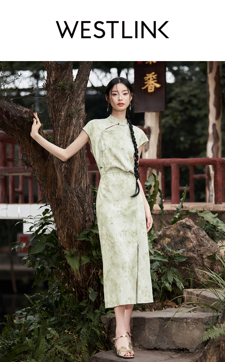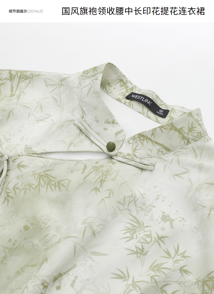 西遇国风收腰印花提花连衣裙女新款旗袍领褶皱开叉裙子D0640372