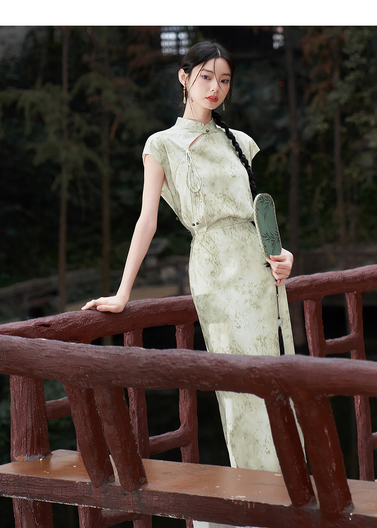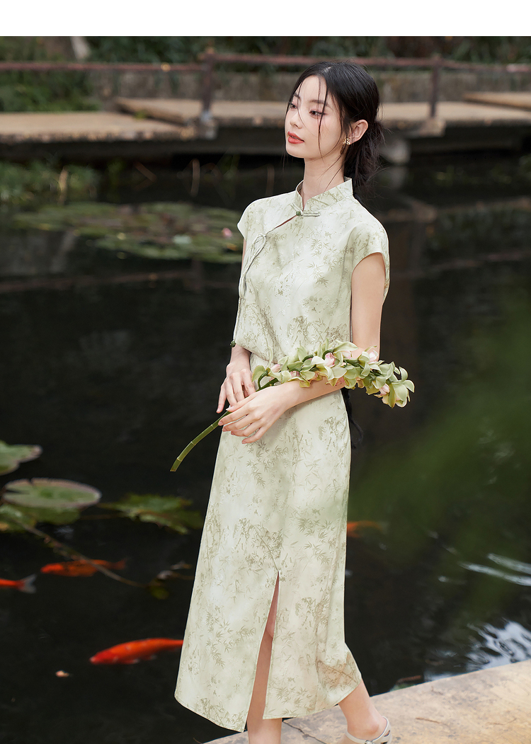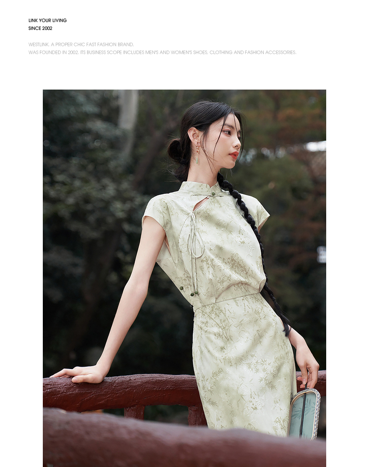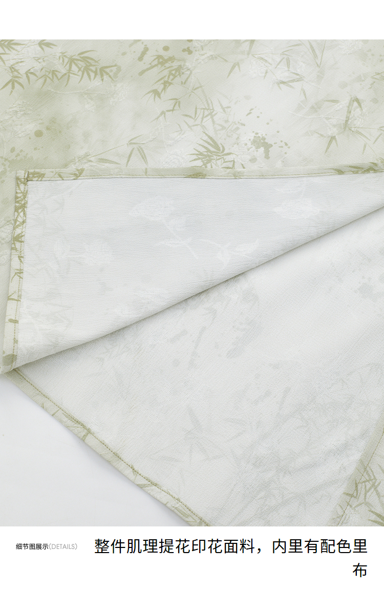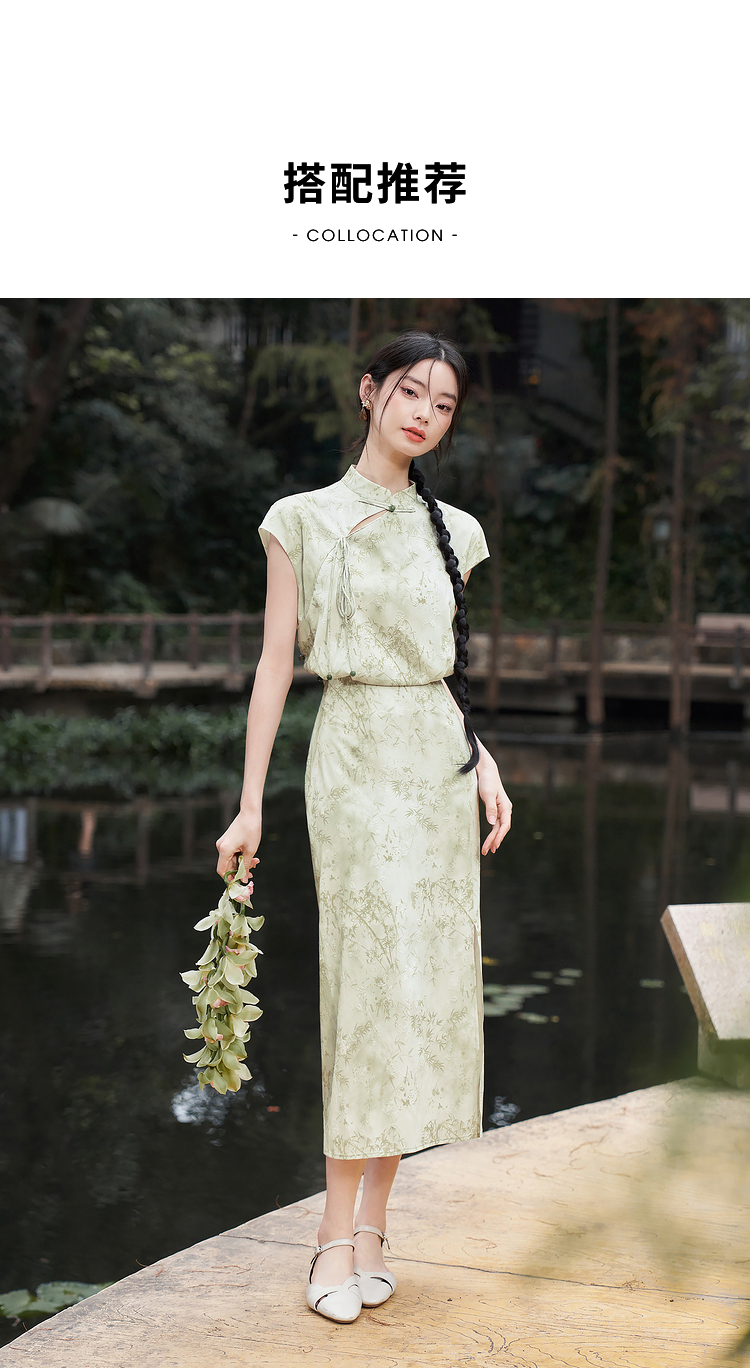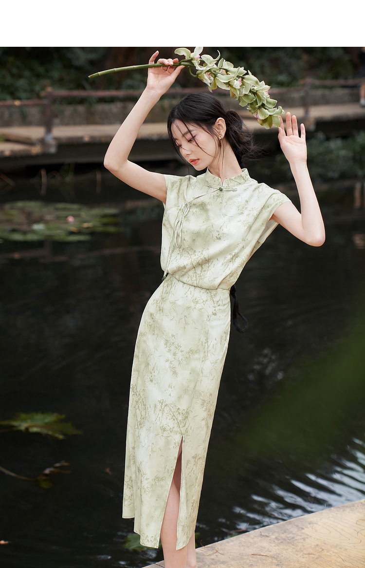 西遇国风收腰印花提花连衣裙女新款旗袍领褶皱开叉裙子D0640372