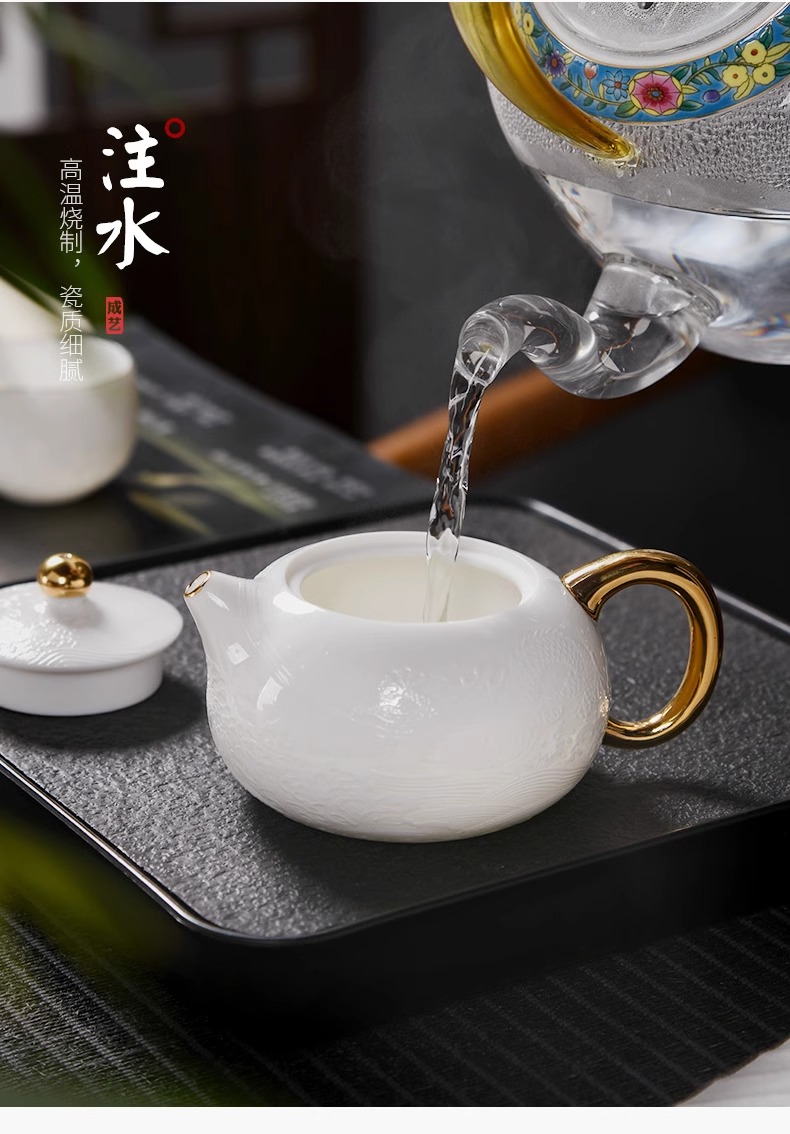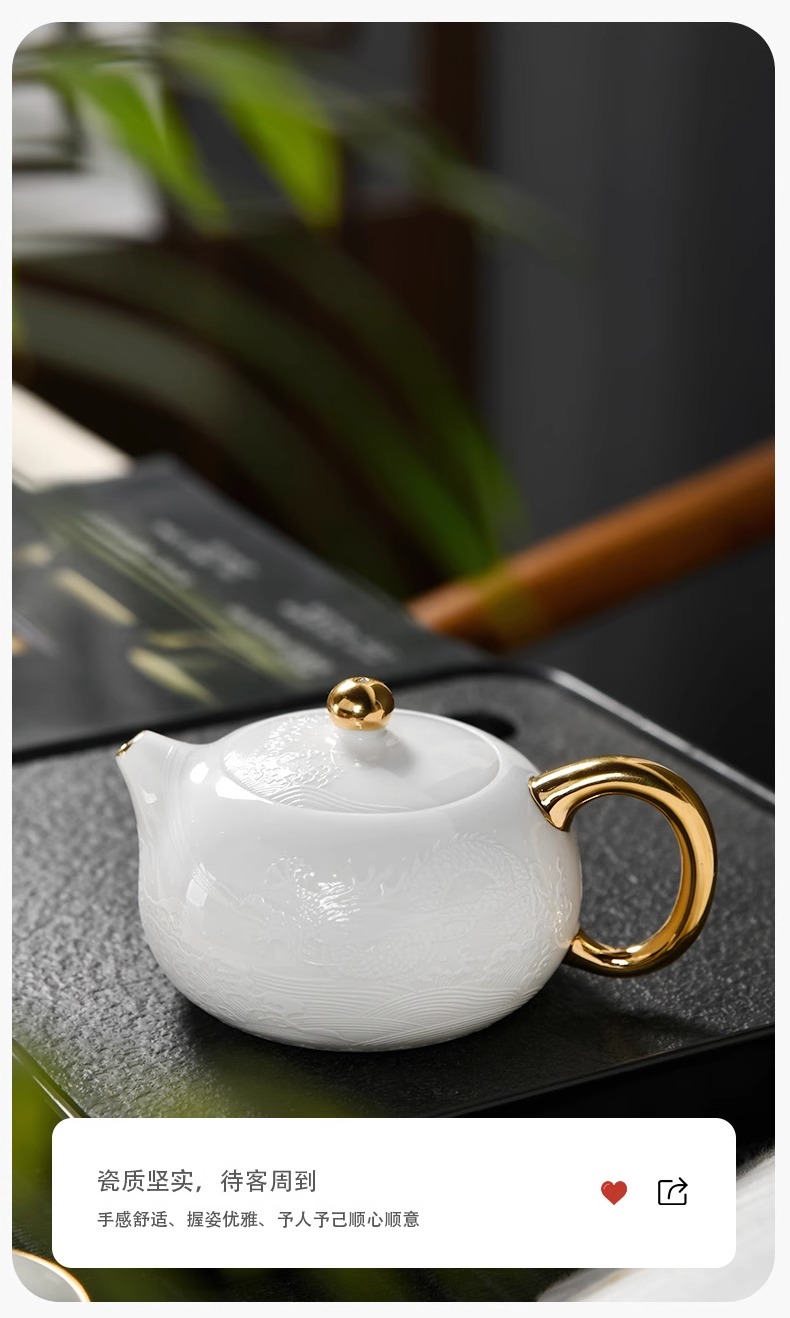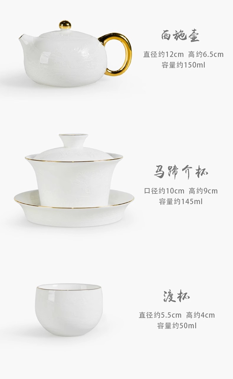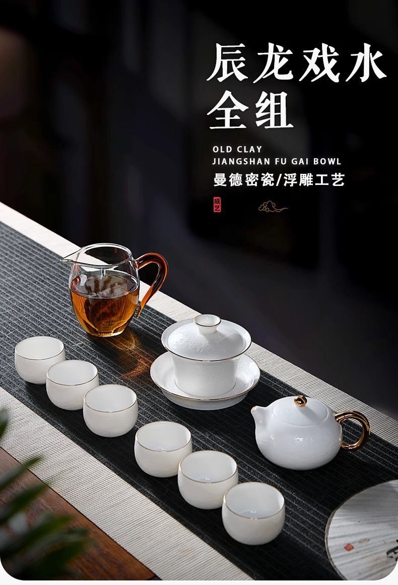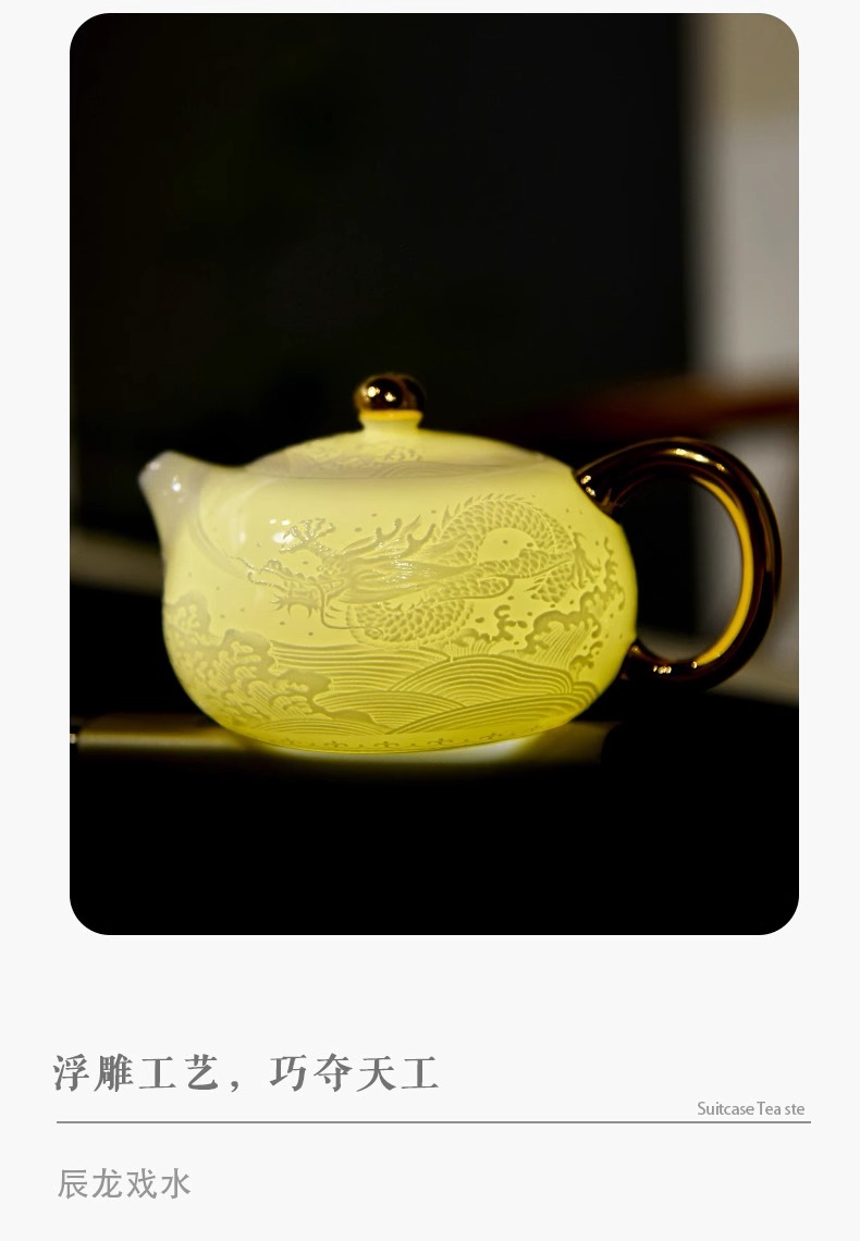 辰龙戏水陶瓷茶具茶碗茶杯浮雕手绘鎏金成艺隐雕辰龙戏水全组(9件套