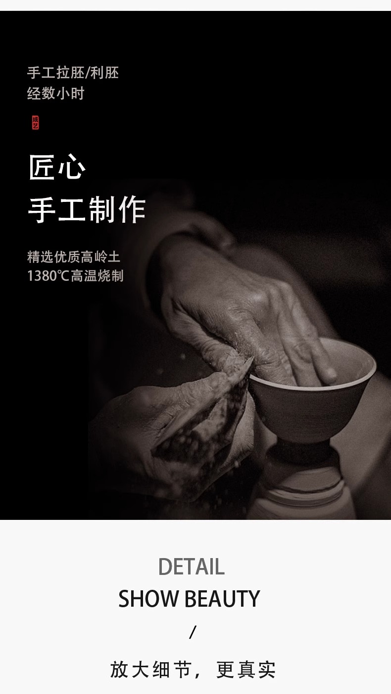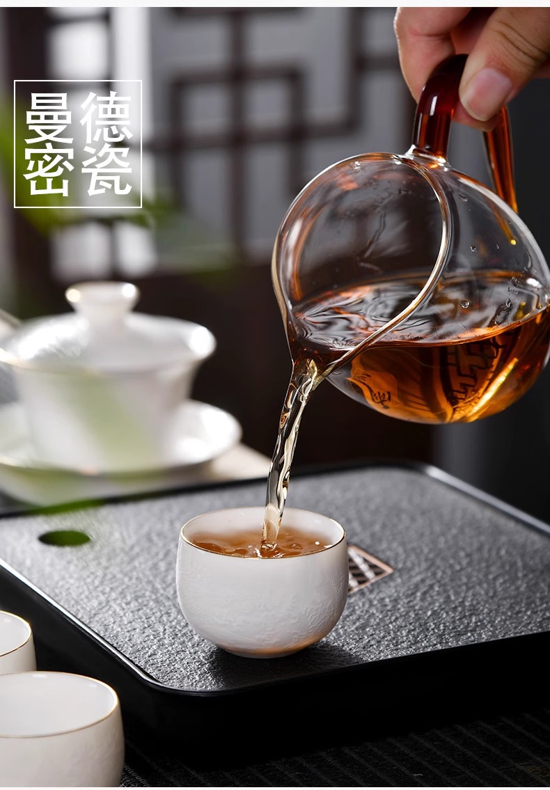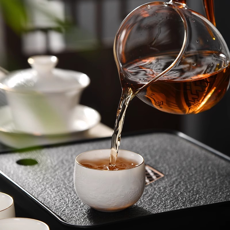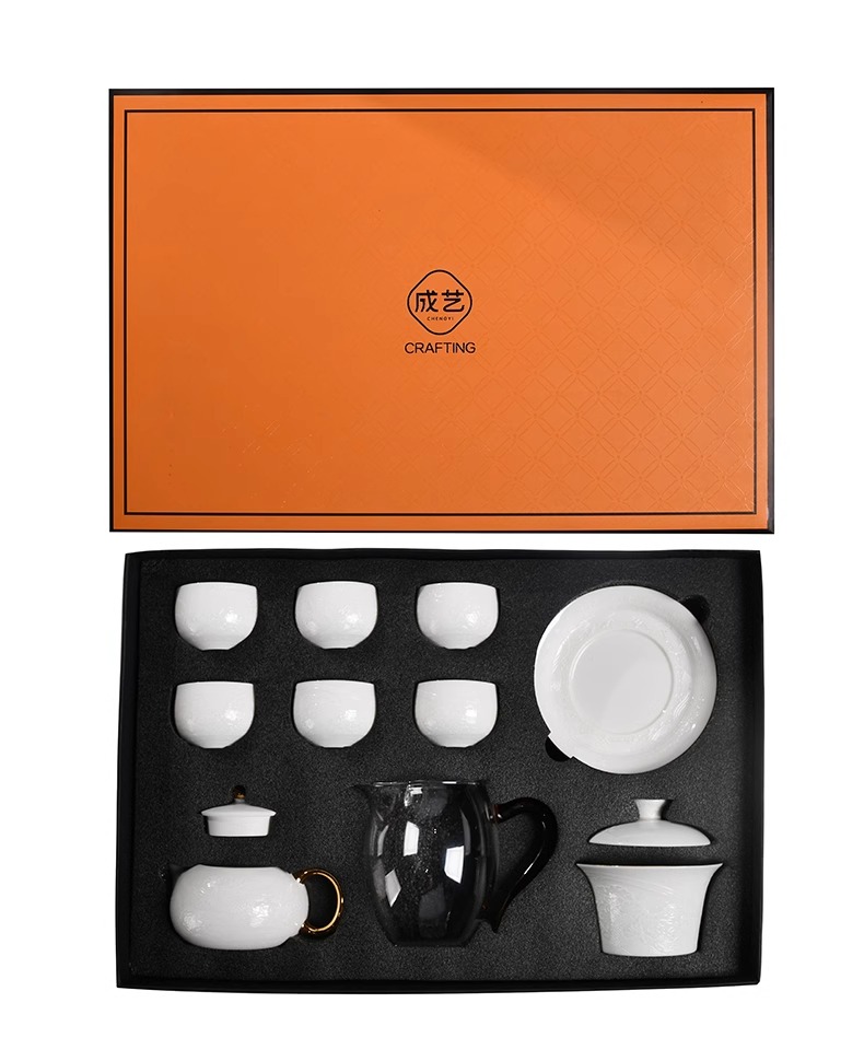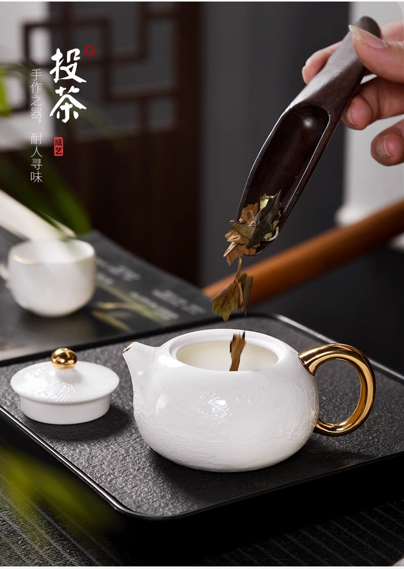 辰龙戏水陶瓷茶具茶碗茶杯浮雕手绘鎏金成艺隐雕辰龙戏水全组(9件套