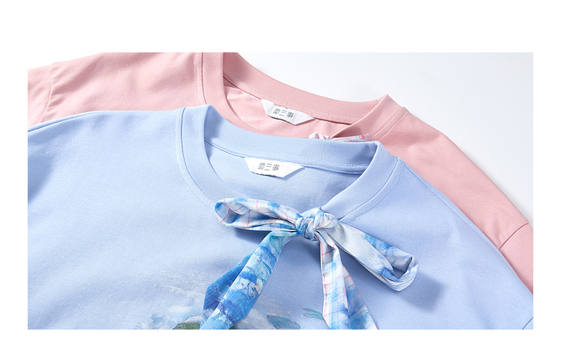 两三事梵高文艺 弦外智音 2025夏季新款彩绳绑带领印花短袖t恤女