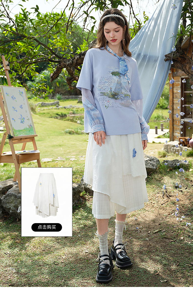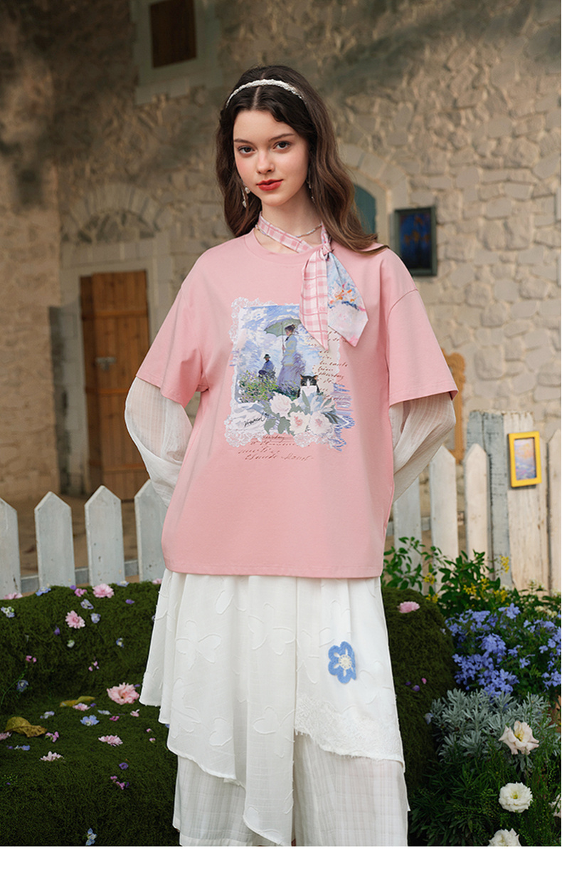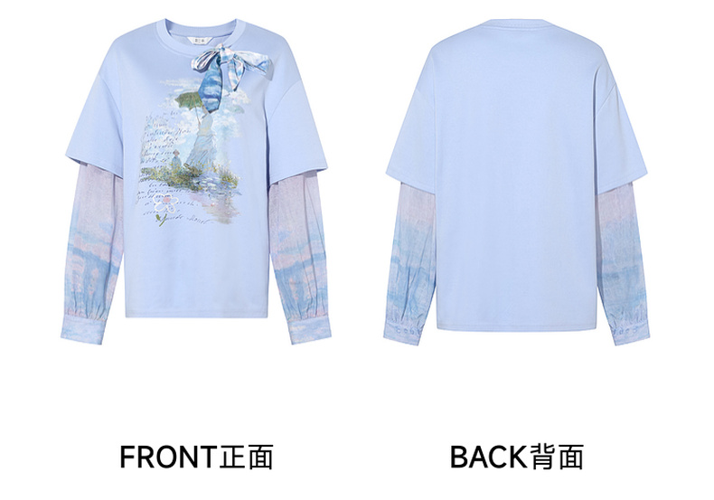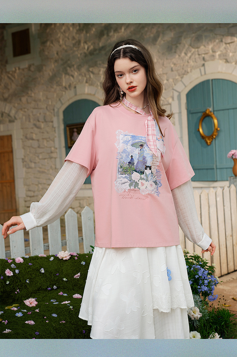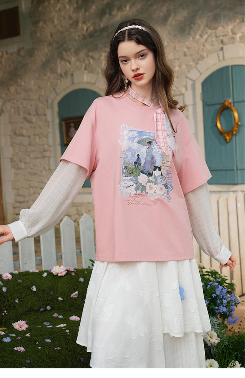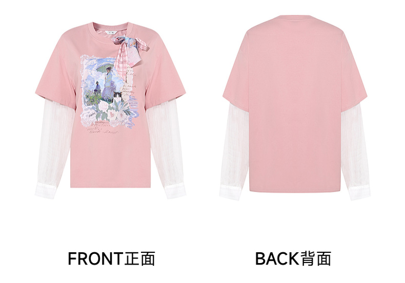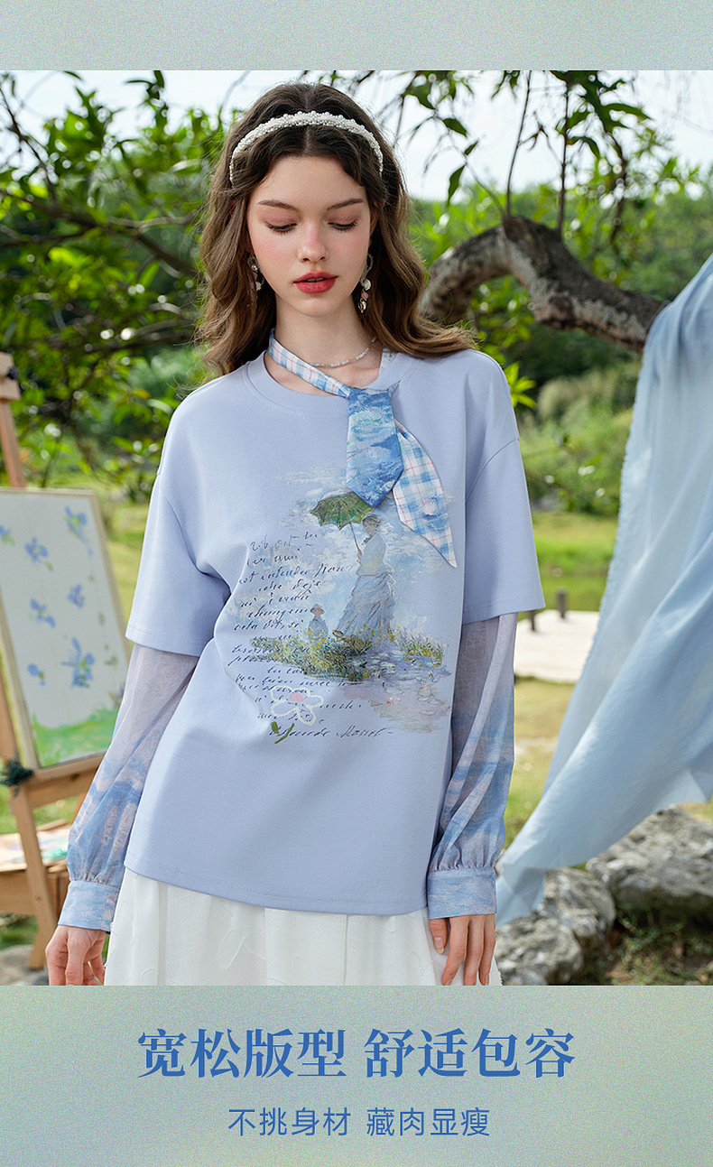 两三事柔光缱绻2025春季新款油画印花绑带拼接袖假两件t恤女宽松S25CT245