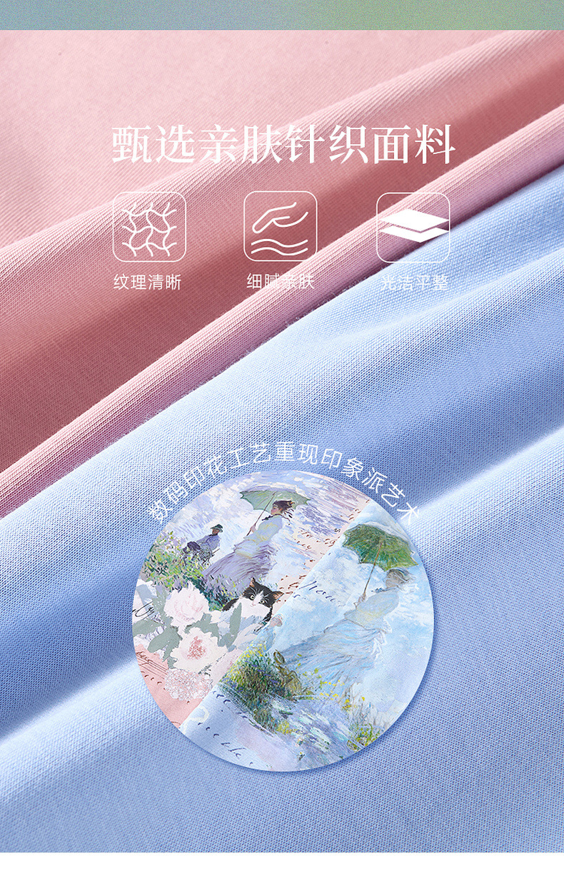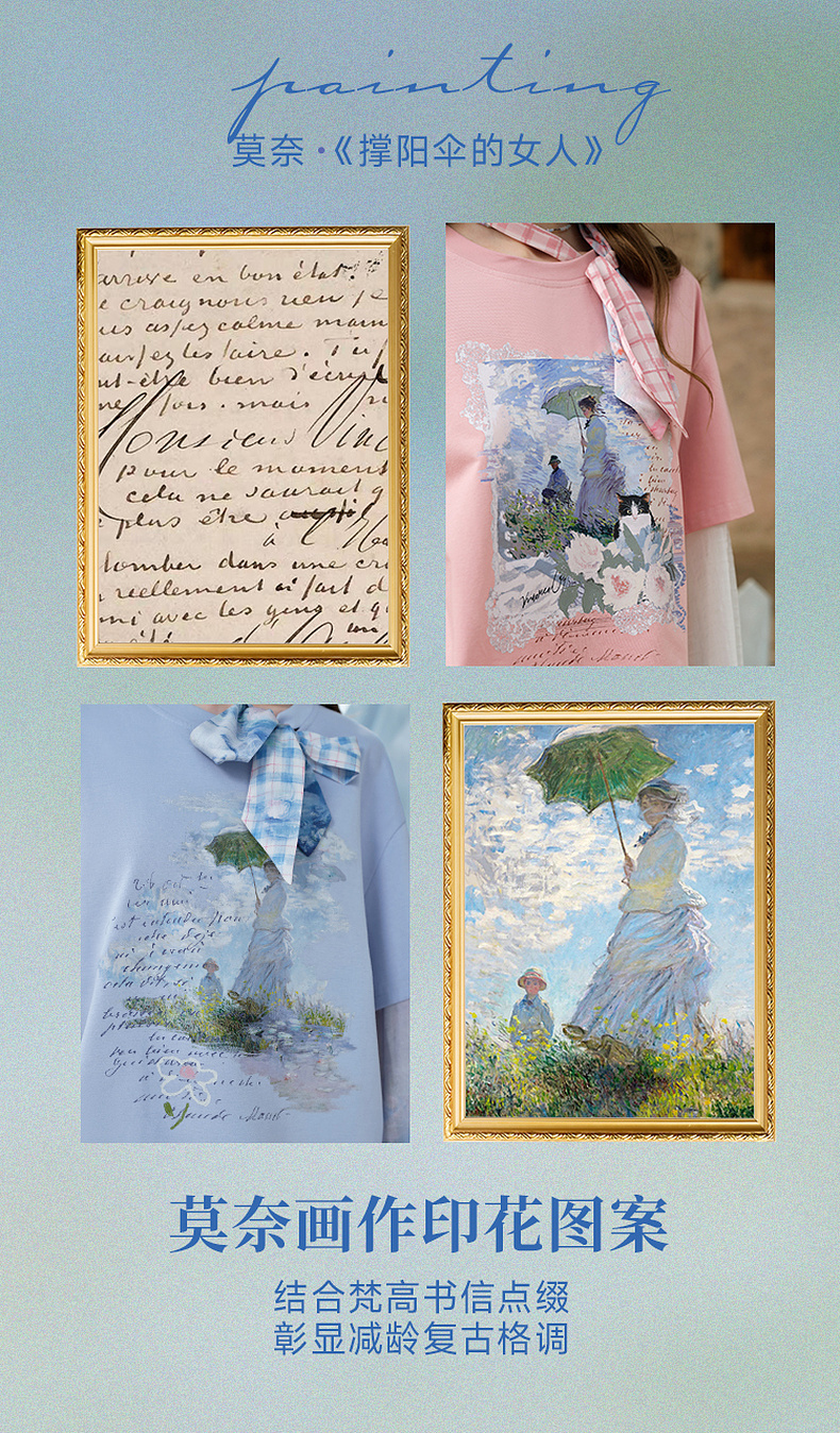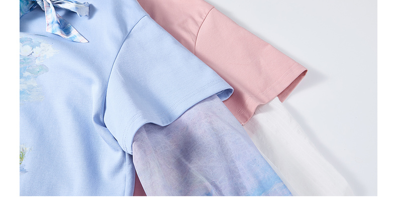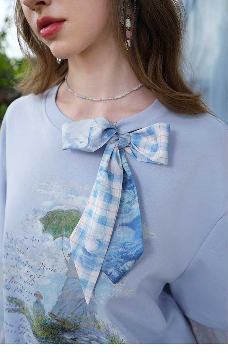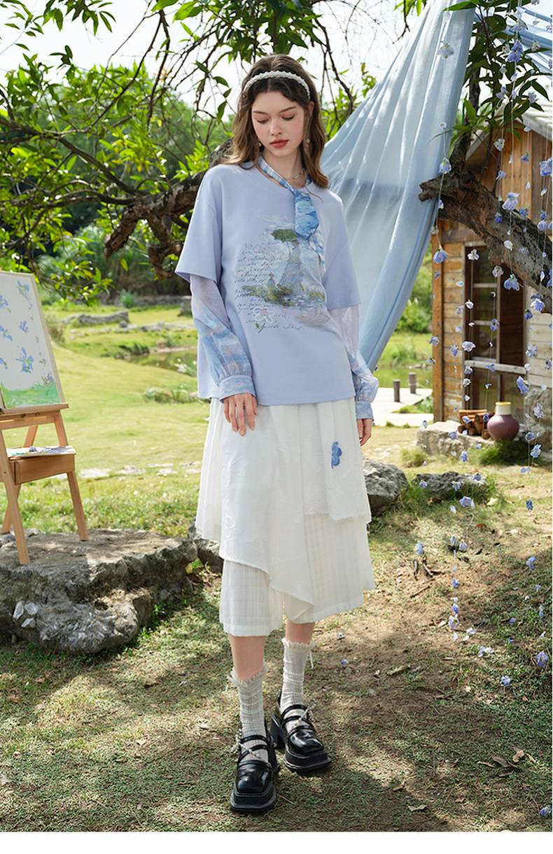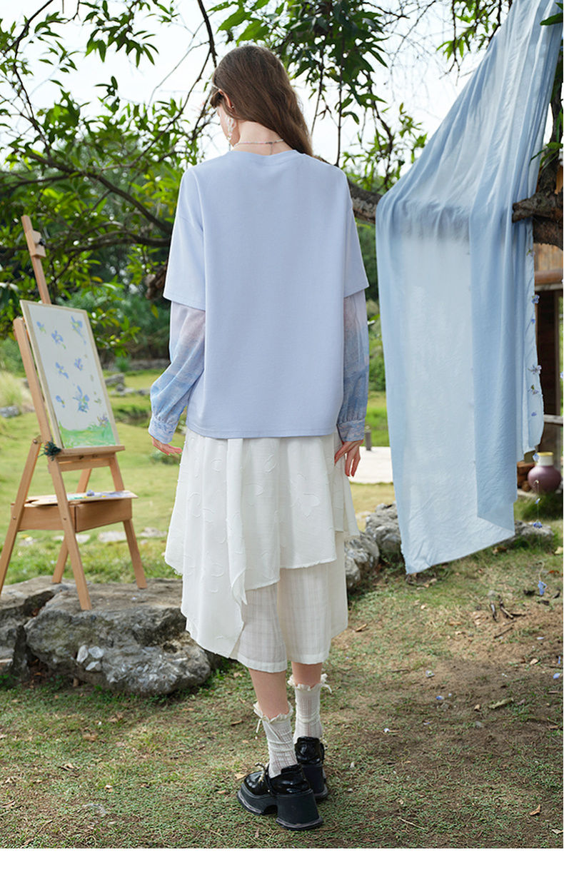 两三事柔光缱绻2025春季新款油画印花绑带拼接袖假两件t恤女宽松S25CT245