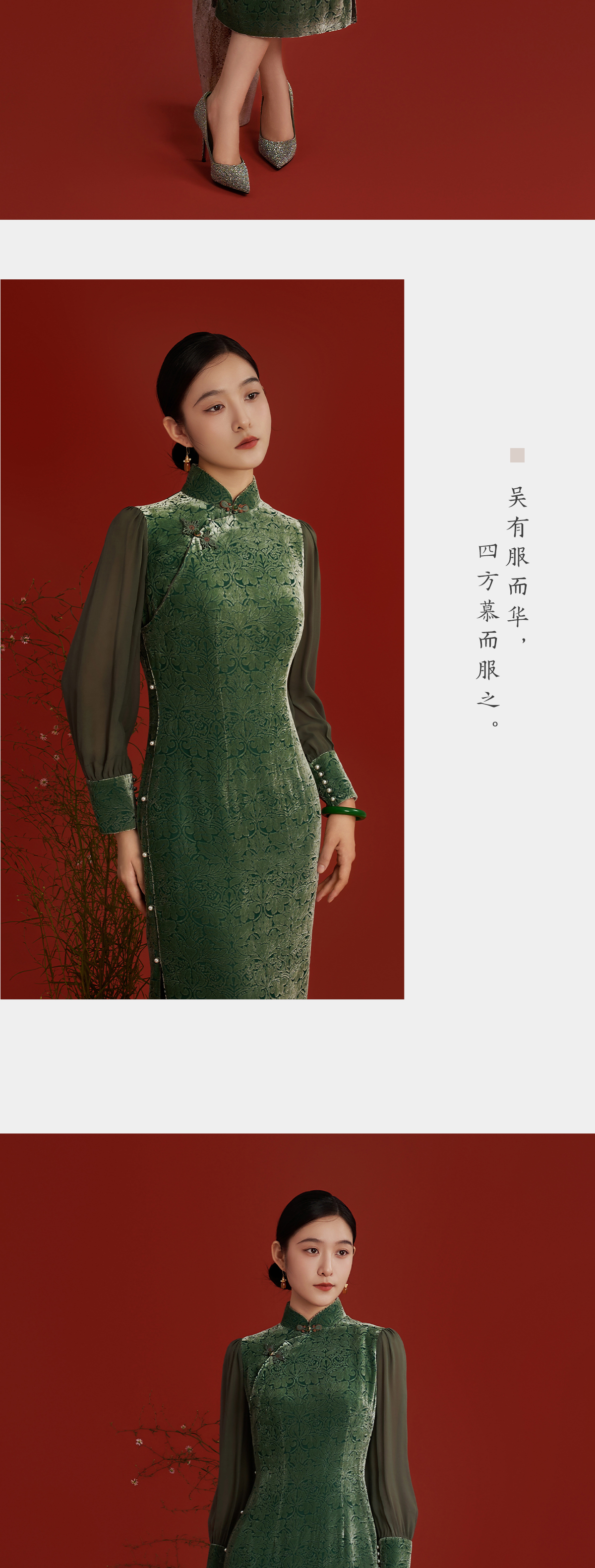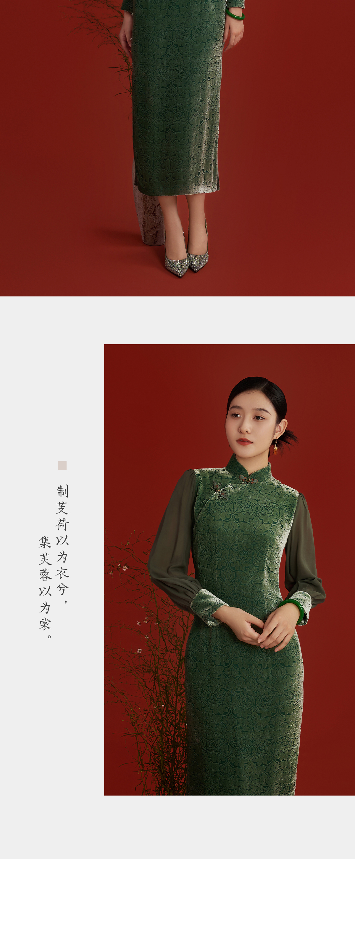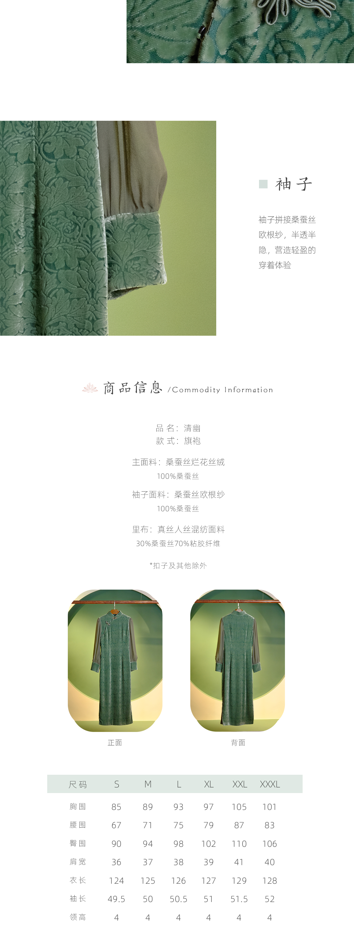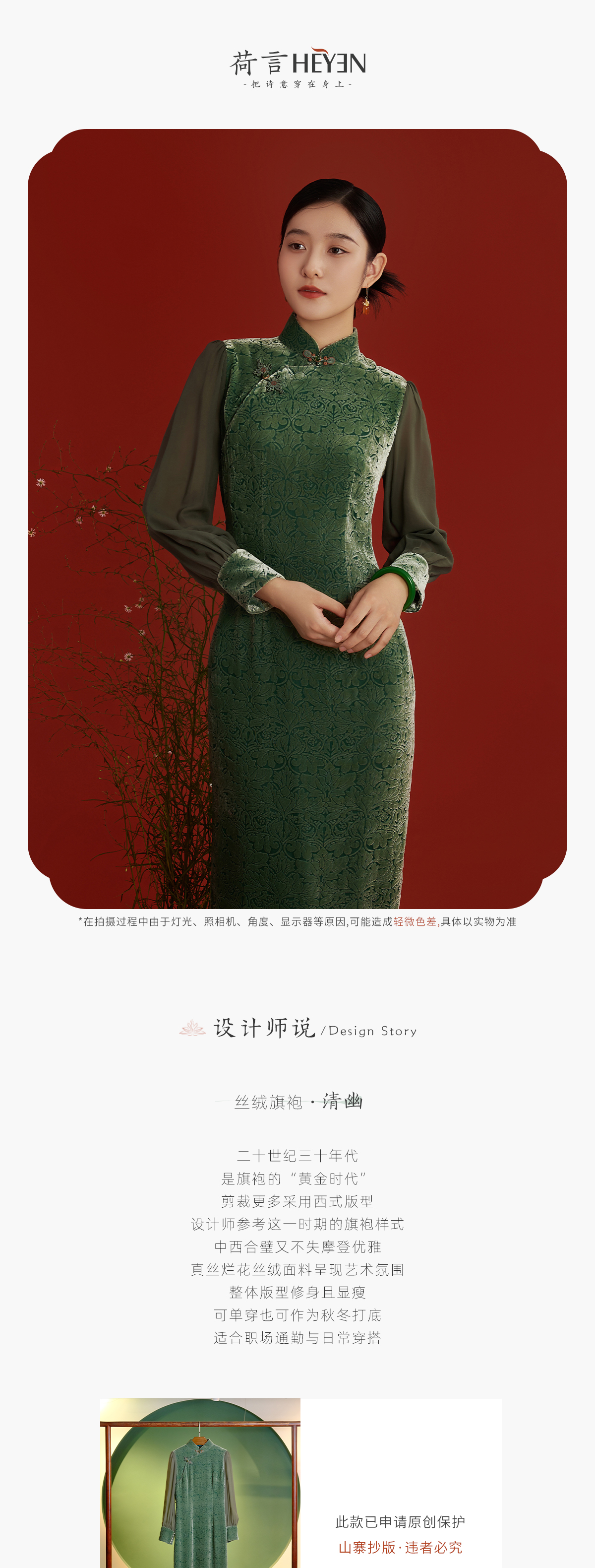荷言GL 清幽 桑蚕丝丝绒长袖真襟旗袍拼接欧根纱袖子手工花篮扣