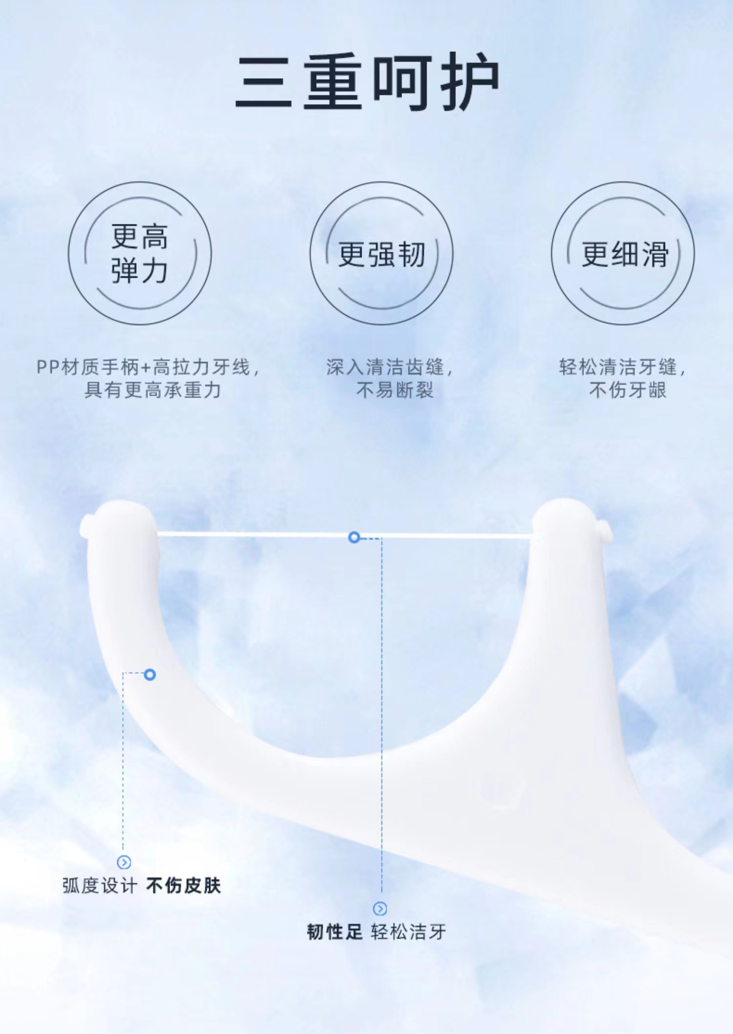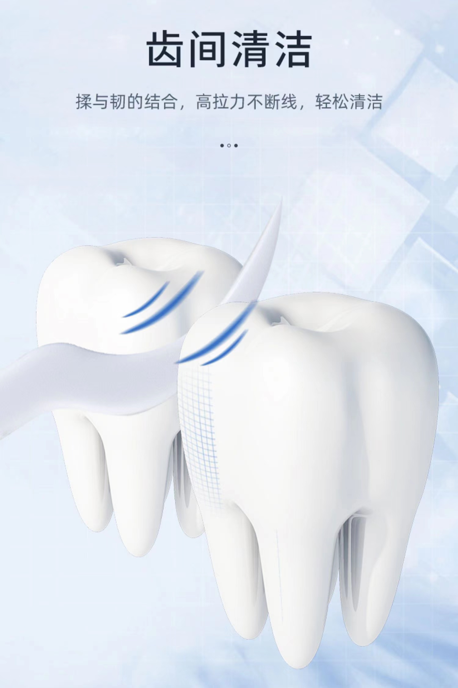 ✅采用高分子细滑牙线,这种线材常用于外科手术缝合,纤细牢度高,可以轻松深入牙齿缝!