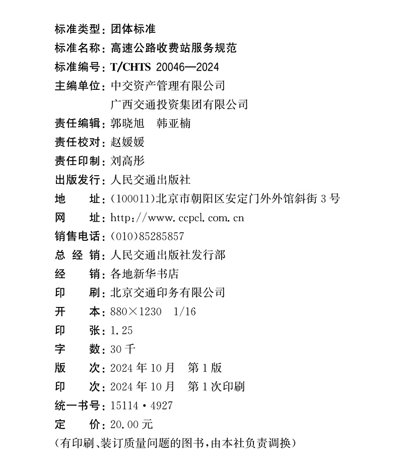 书名:高速公路收费站服务规范(T/CHTS 20046—2024)