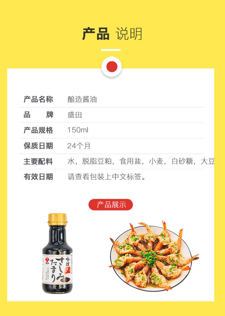 日本进口食品调味料 盛田刺身生鱼片酱油 日本料理 150ml