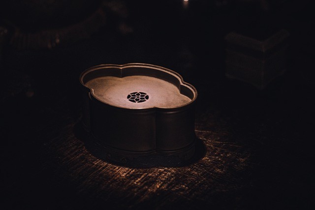花瓣形壶承上盖,中间镶嵌有纯铜葵花纹镂空水口,做工精美,为点睛之笔,中心内凹便于引流,上盖与器身扣合美观,高低搭配、错落有致。棱角方圆,拙细明暗的设计,美感十足。
