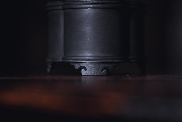 壶承底部有四个祥云纹脚钉支撑壶身,恰如其分的承托了壶承与桌面之间的关系,是壶承放置平稳不易移位。壶承颜色中灰调偏深沉,安静雅致,纯锡质地,使用越久,味道越足。