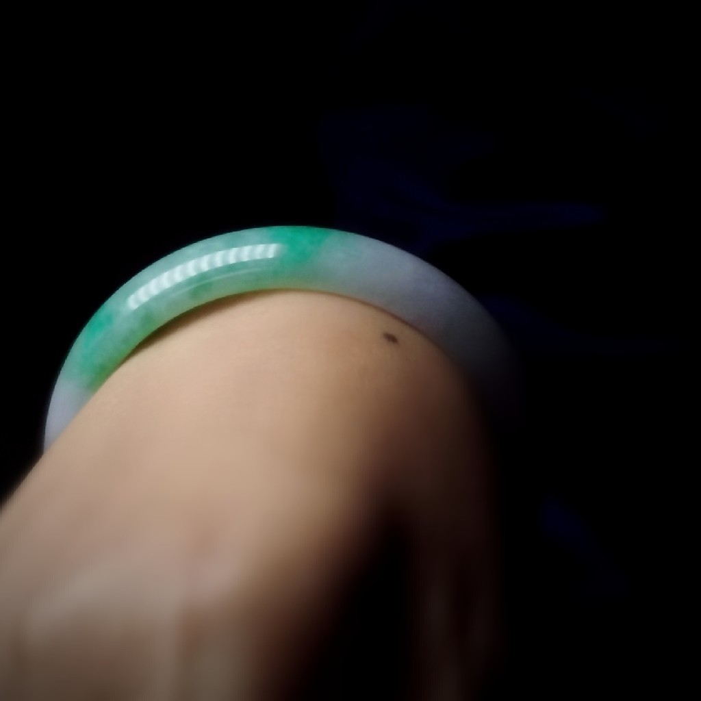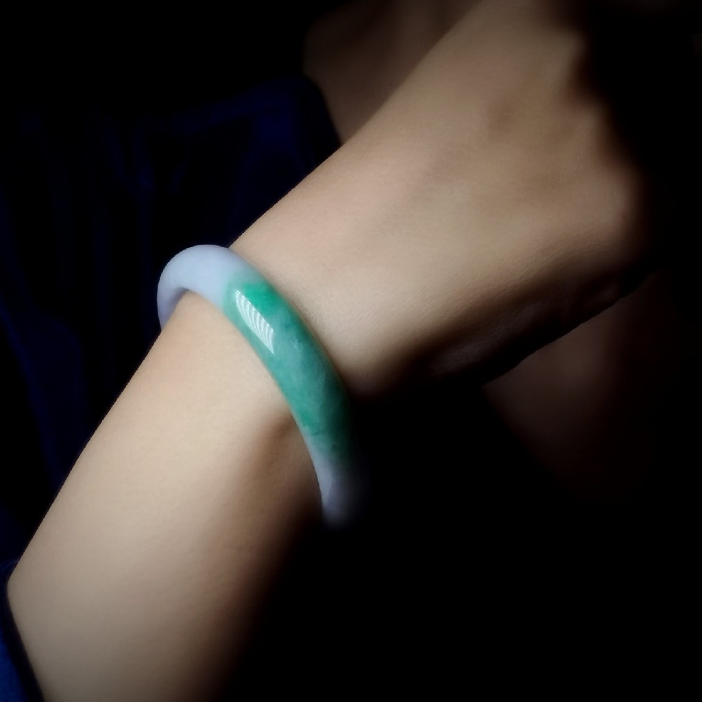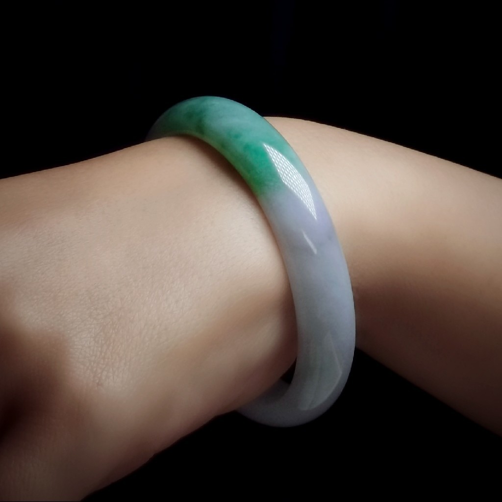 这是一只春带彩翡翠手镯,淡淡的紫罗兰,搭配大片的恬淡葱心绿色,上手明艳漂亮。