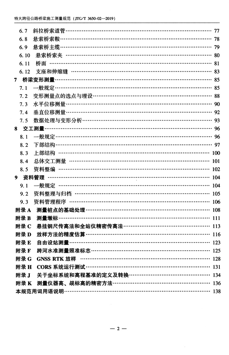 本规范包括9章和10个附录,主要内容为:总则、术语和符号、平面控制测量、高程控制测量、施工测量的基本工作、桥梁施工测量、桥梁变形测量、交工测量和资料管理。