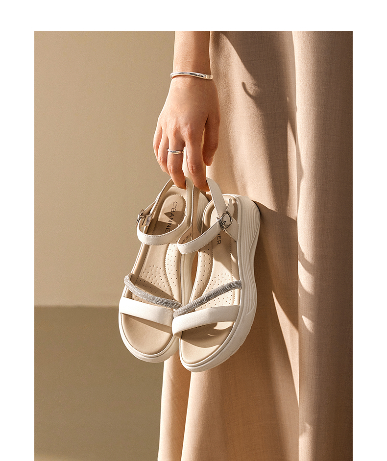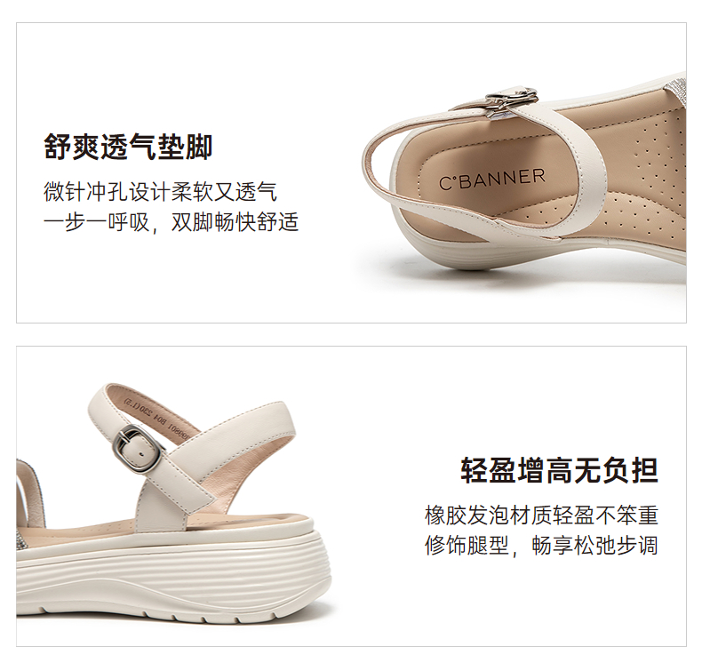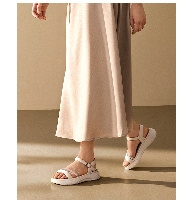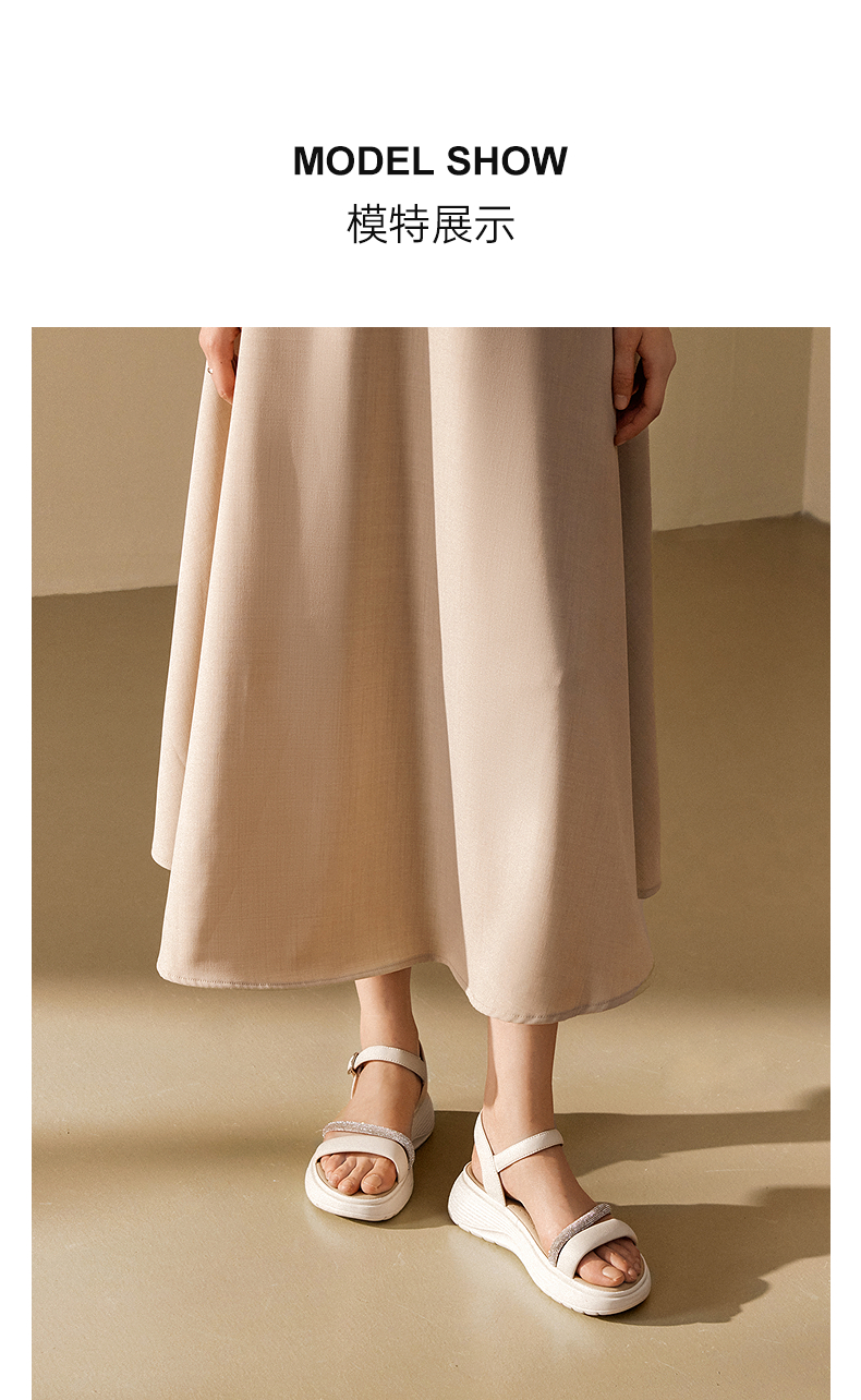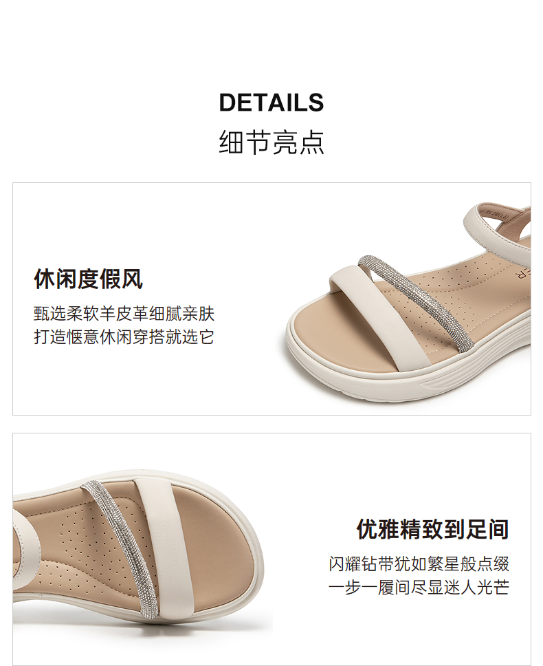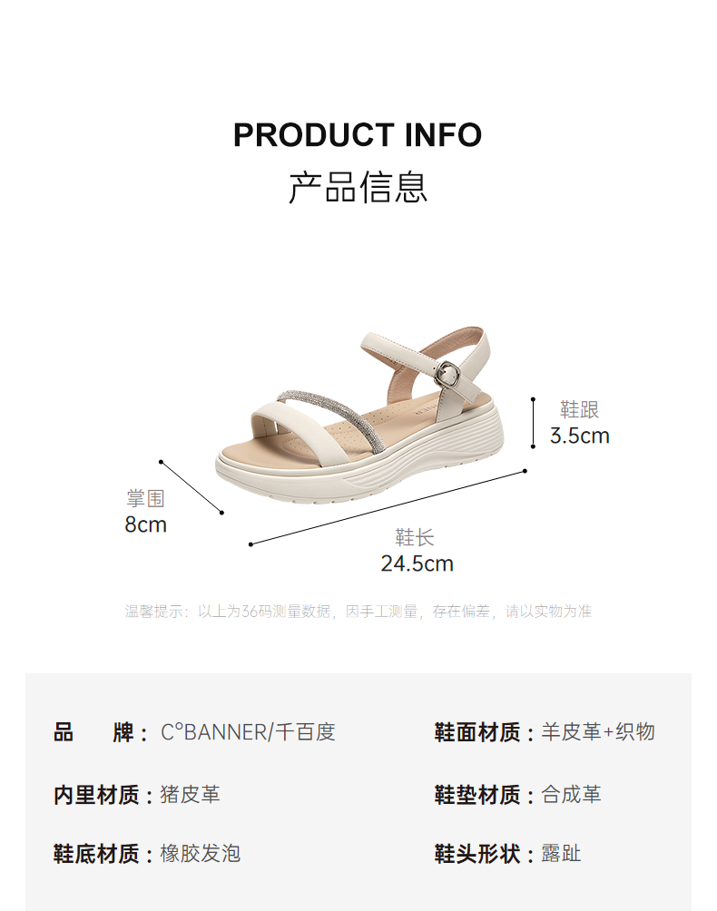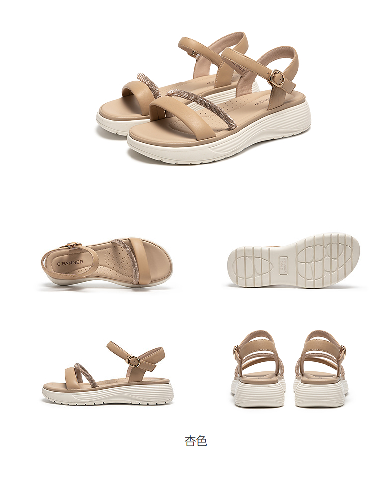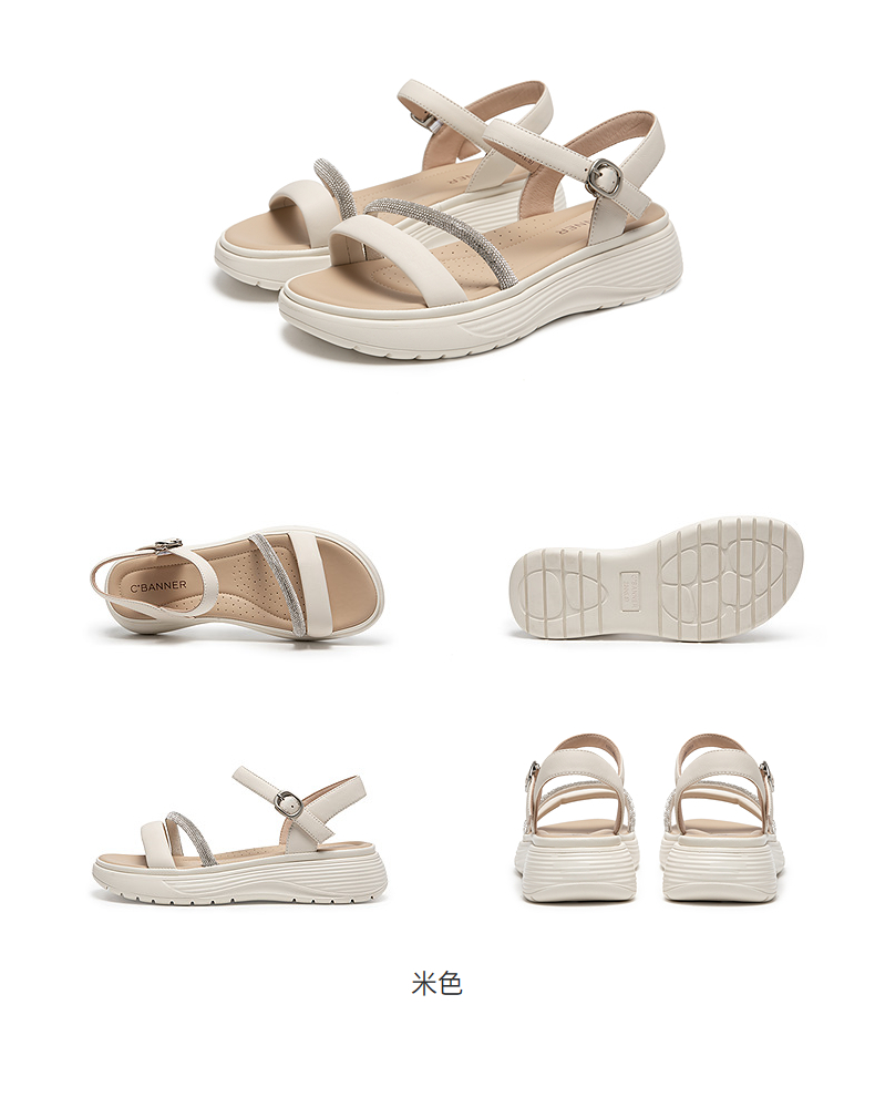千百度厚底羊皮一字带休闲凉鞋女增高度假海边凉鞋A25399801