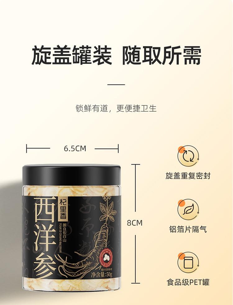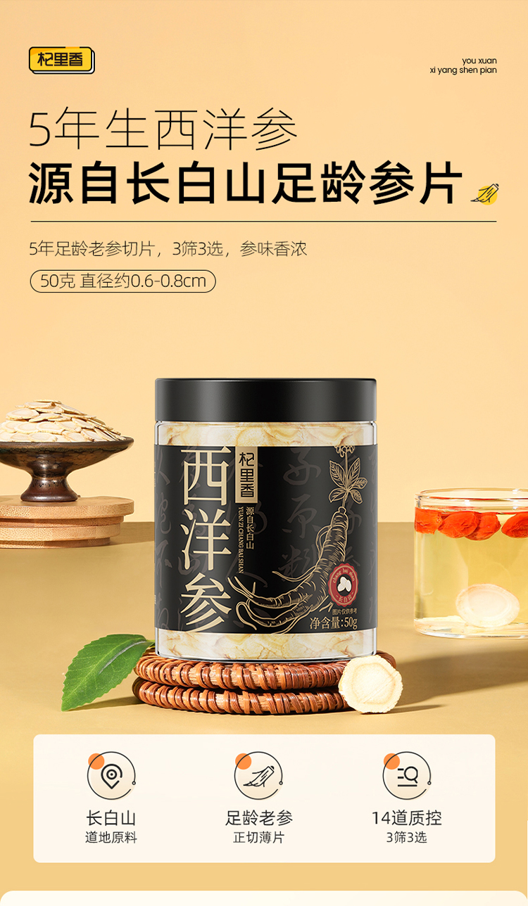 【杞里香西洋参片(0.6-0.8cm)、 (1.0-1.2cm)、(1.4-1.6cm)50g】5年黄金参龄,皂甙含量更高