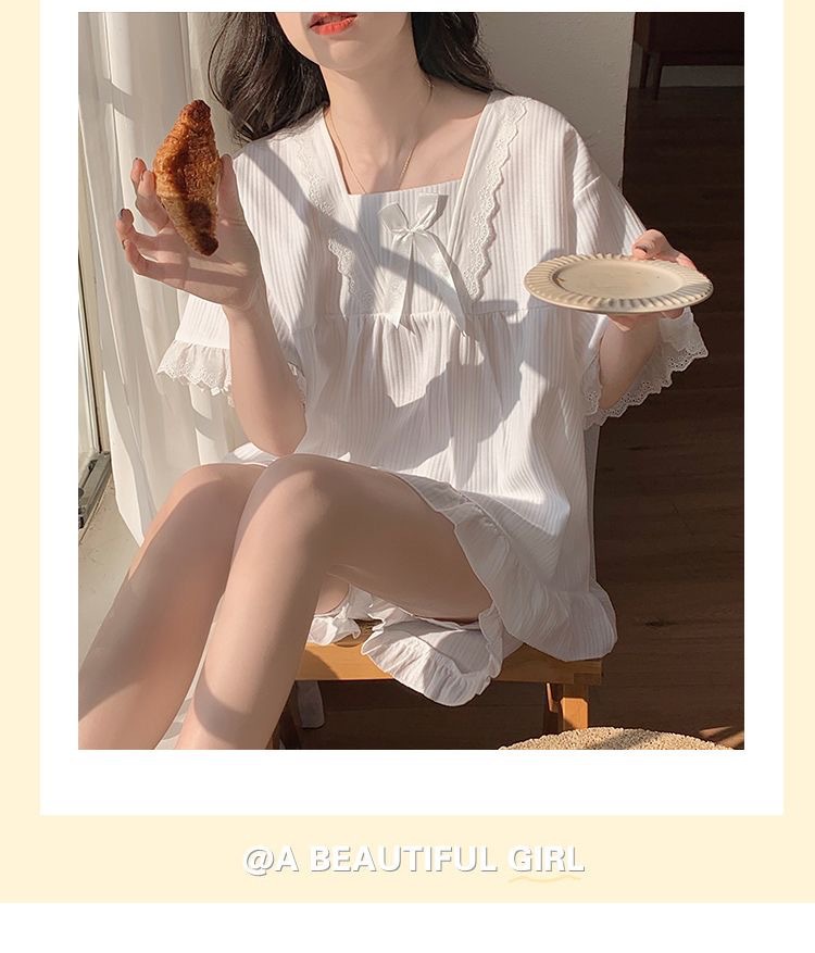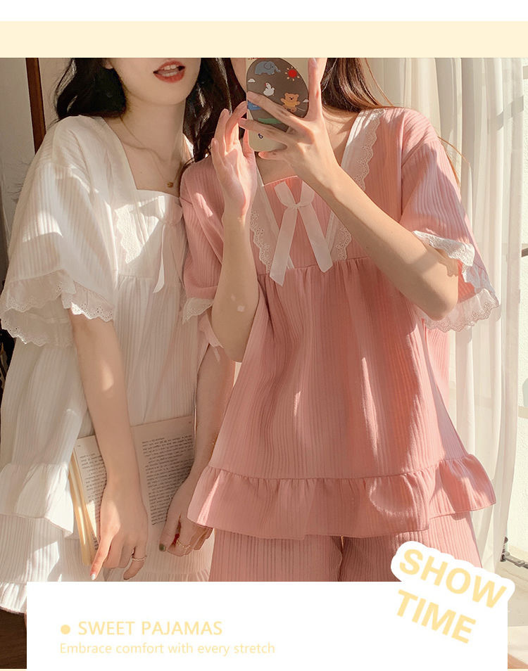 宫廷风睡衣女士夏季短袖带胸垫韩系方领小个子甜美闺蜜家居服套装