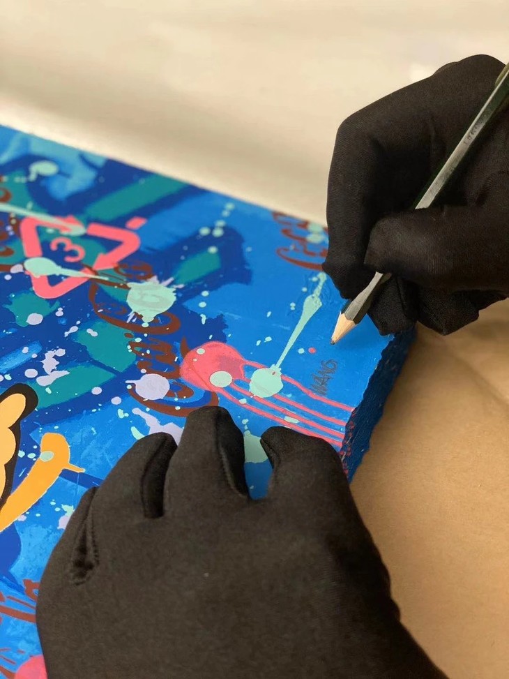 制作工艺:纯手工制作丝网版画,一共25版专色套色印刷,加入了夜光材料,日光照射20分钟,黑暗处可以发光2~5小时。