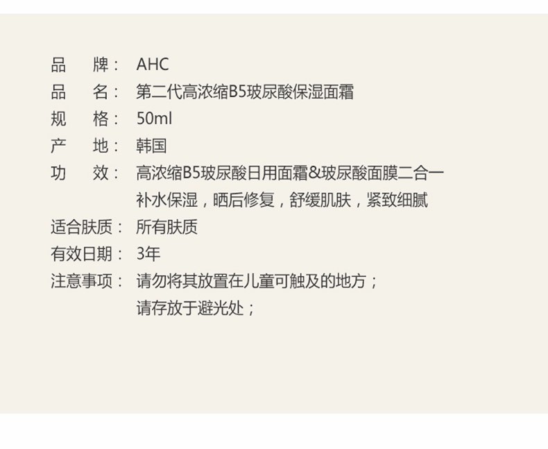 AHC 第2代B5波尿酸面霜 50ML 韩国