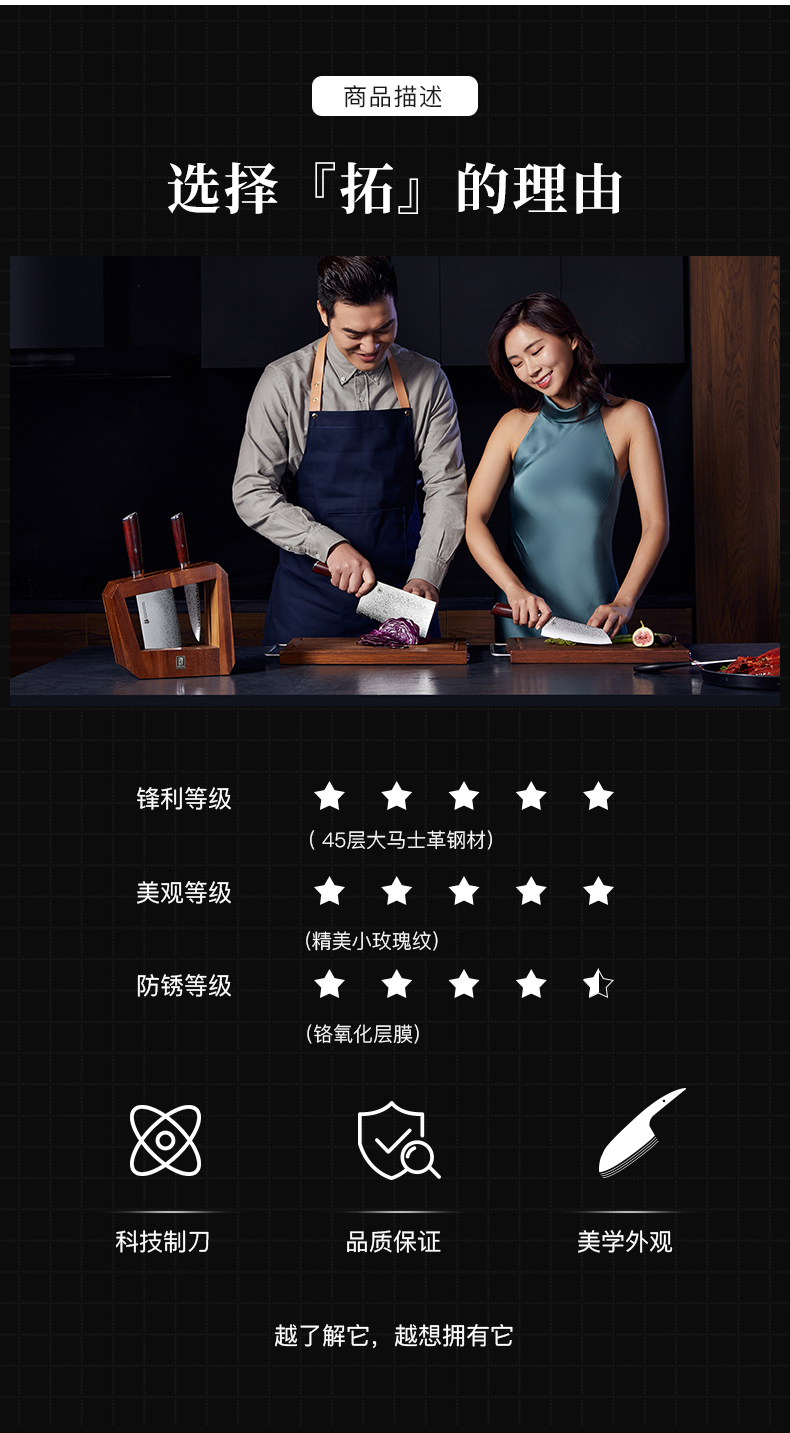 “拓”牌刀具为广东拓必拓科技股份有限公司旗下品牌,一直专注于研究、生产、销售专业厨房刀具,并与欧美、日本、台湾地区等多家知名品牌刀具进行合作,产品行销欧洲、美洲、日本等三十几个国家和地区。