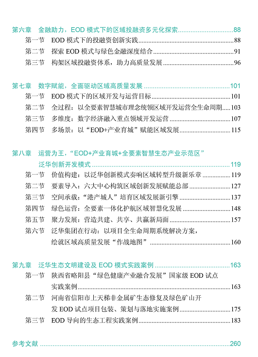 在生态文明、绿色发展、“双碳”目标背景下以及乡村振兴、新型城镇化建设进程中,探索绿色高质量发展模式与路径已经成为时代命题。EOD模式正是将生态治理与产业发展有机融合的发展方式,是生态资源产品化、生态功能产业化、产业发展生态化等“变绿水青山为金山银山”的价值转化过程,既是一种绿色可持续的区域发展模式,也是一种项目组织开发方式。本书深入分析EOD模式政策背景、发展内涵、实施路径,探索以EOD试点为抓手,全面推动乡村振兴、绿色转型高质量发展。泛华集团融合30年新型城镇化发展创新理念和数百个实践案例,将战略思维、系统思维、创新思维及项目思维有机结合,创新提出“生态为基、产业为魂、金融助力、数字赋能、运营为王”的发展思路及“EOD+产业育城+全要素智慧生态产业示范区”发展创新模式。围绕区域资源禀赋和现状需求,通过重构生态,实现生态产品价值转化;重塑产业,激发新经济造血机能;金融为器,为区域经济插上翅膀;数字赋能,为区域智慧化发展按下“快进键”,多维度解决区域发展瓶颈。形成以乡村振兴为点,生态文明建设为线,生态产业化构面,产业生态化筑体,点、线、面、体四维融合的创新发展。助力区域迈入生态振兴、产业重塑、新型城镇化、城市更新、乡村振兴高质量发展新阶段,为进一步推动“30·60”双碳目标、生态文明建设国家战略不断奋进。