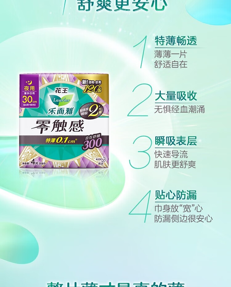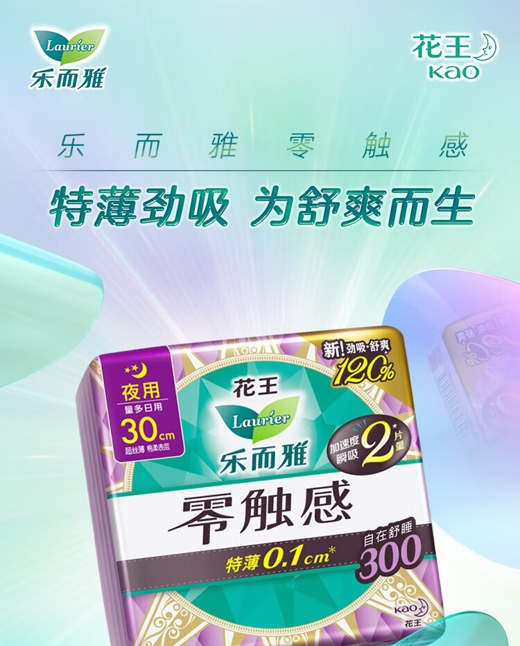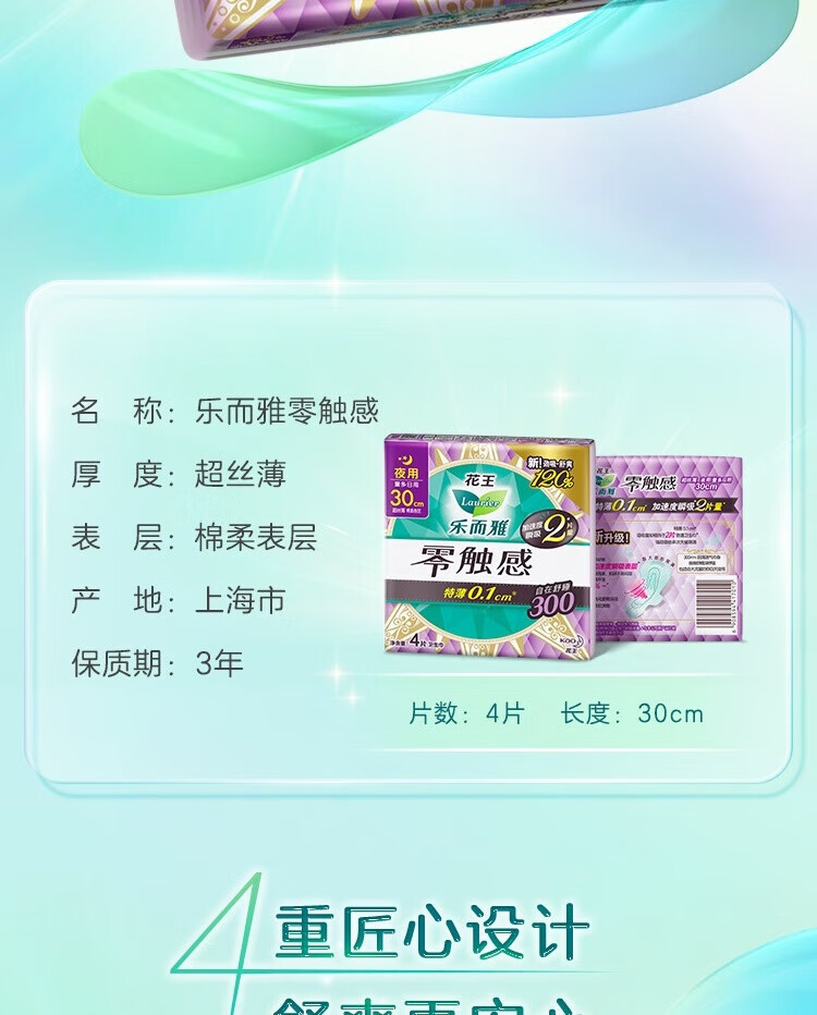 乐而雅零触感特薄夜用卫生巾30cm4片/包