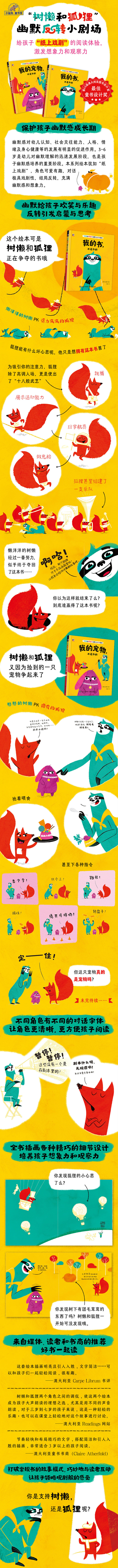 《“树懒和狐狸”幽默反转小剧场》系列是树懒和狐狸的故事,共两本,犹如“纸上剧场”,角色可爱有趣,对话极具戏剧性,结局反转,充满幽默感和想象力。《我的书,不是你的》中慵懒的树懒和充满活力的狐狸为了争夺你正在阅读的这个绘本,使出了十八般武艺——杂耍、跳舞、吹号打鼓、扮演飞行员、比拼画画……究竟他俩谁能占有这本书,赢得你的关注呢?《我的宠物,不是你的》中憨憨的树懒和调皮的狐狸都自以为捡到了一只宠物,他们想尽办法争做宠物的主人,争着给宠物起名字、喂食、下各种指令……但这只宠物真的是宠物吗?
