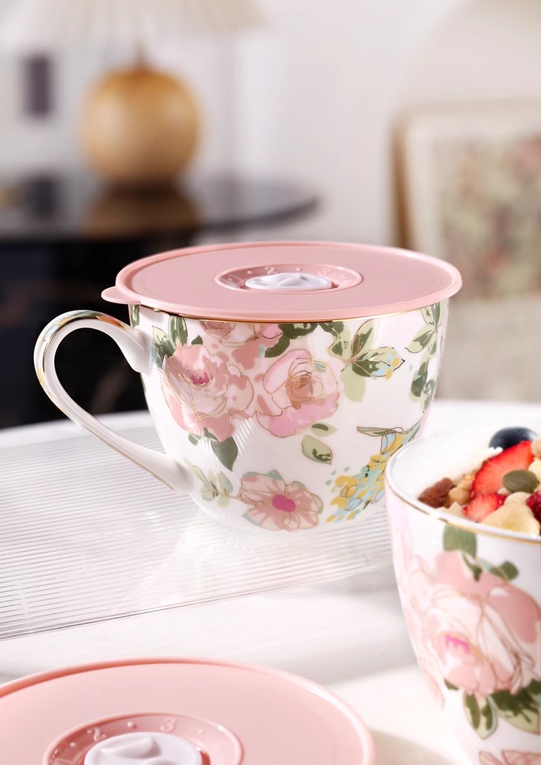 nosin诺轩早餐杯子燕麦杯陶瓷泡麦片田园风大容量马克杯带盖水杯诺轩骨瓷野玫瑰早餐杯