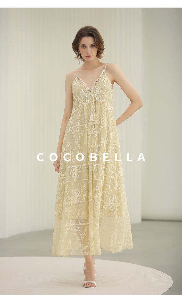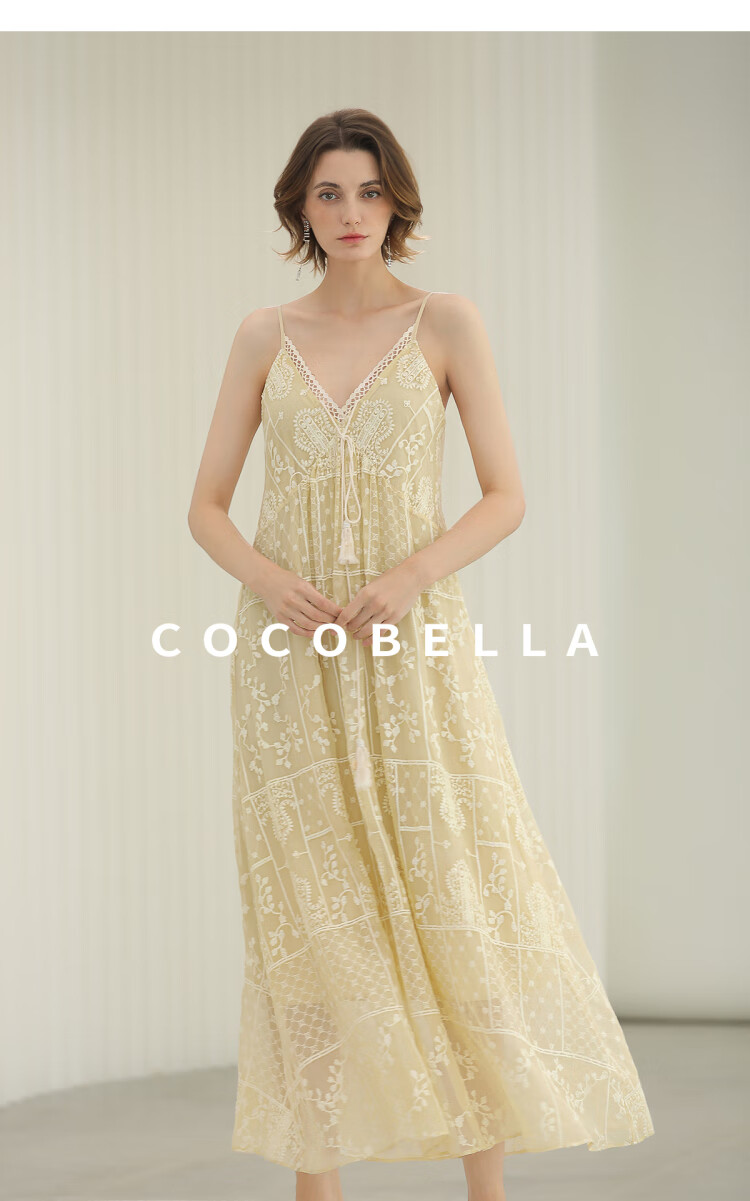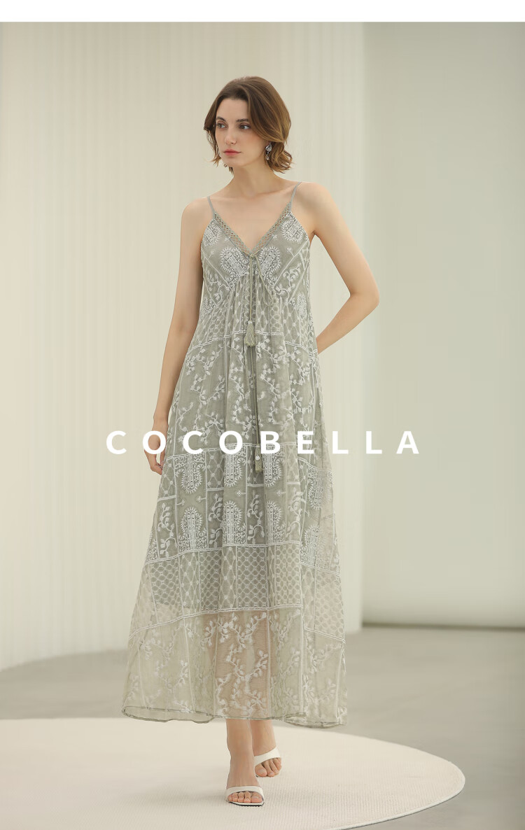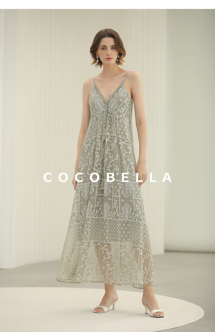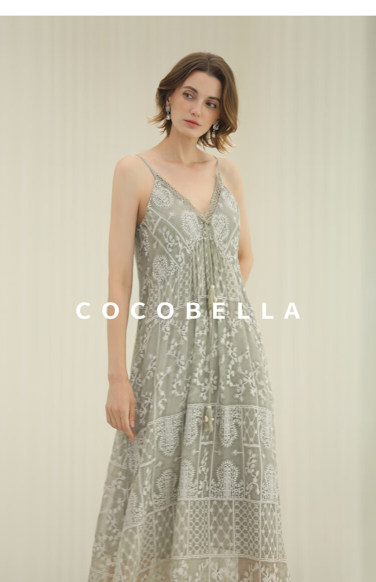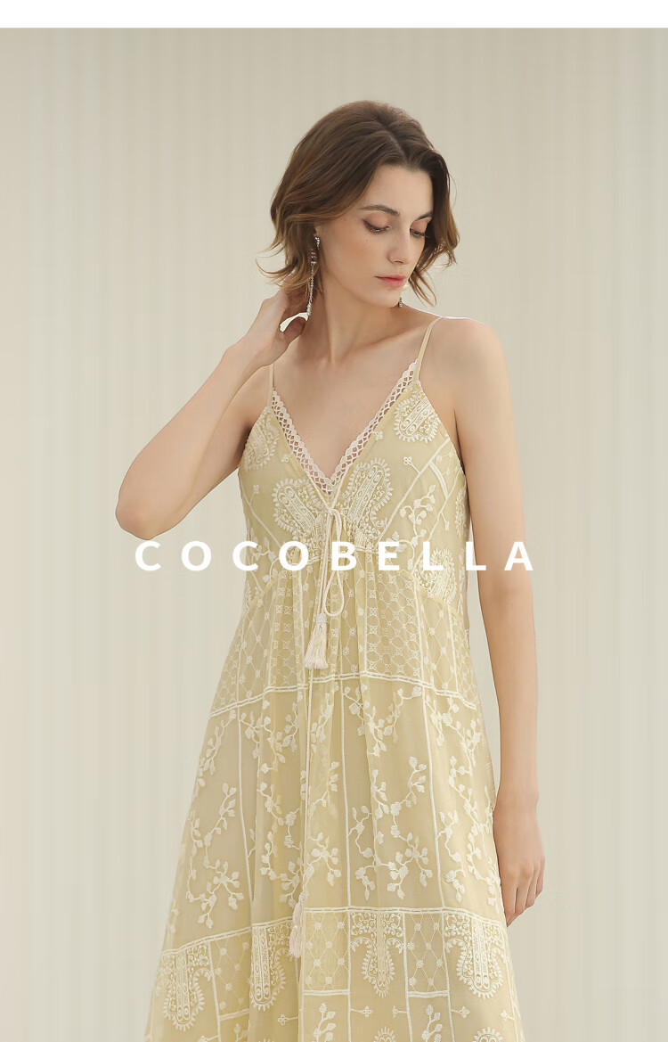 COCOBELLA万针刺绣炒色流苏仙女连衣裙蕾丝拼接吊带裙FR0079