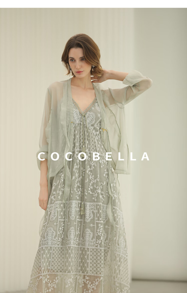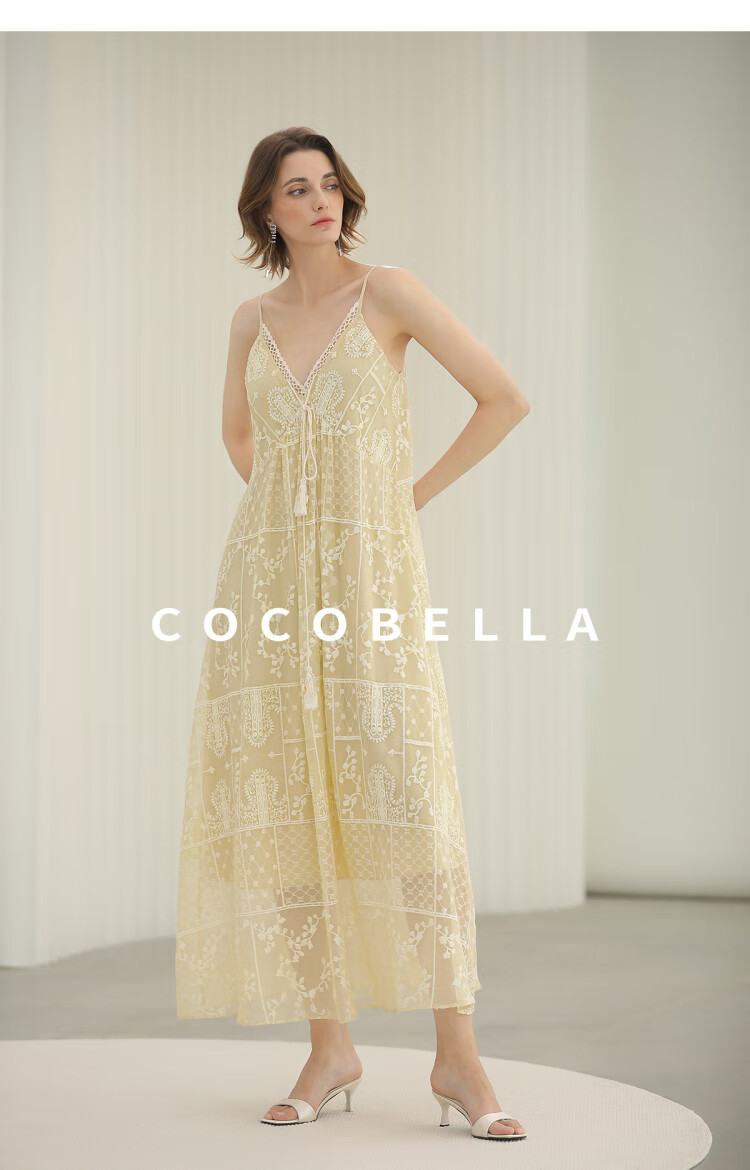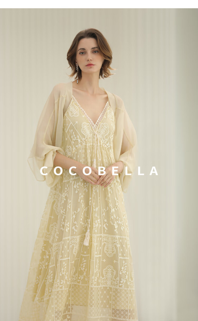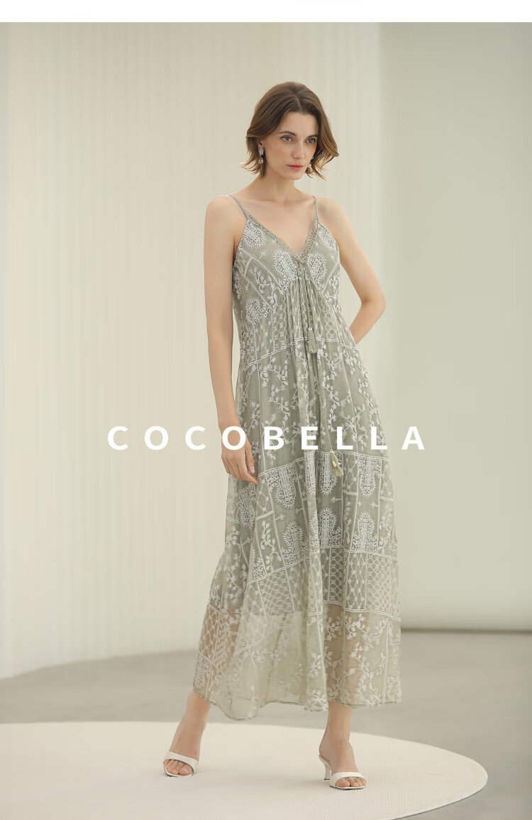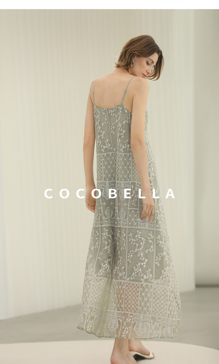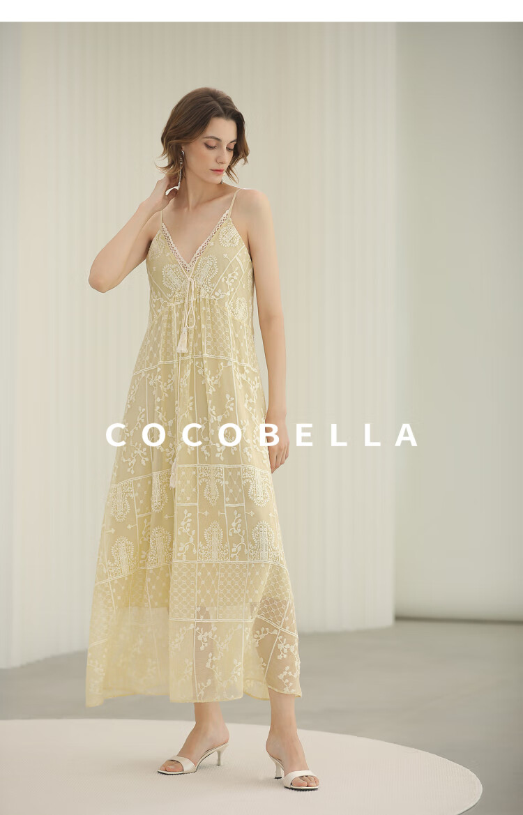 COCOBELLA万针刺绣炒色流苏仙女连衣裙蕾丝拼接吊带裙FR0079