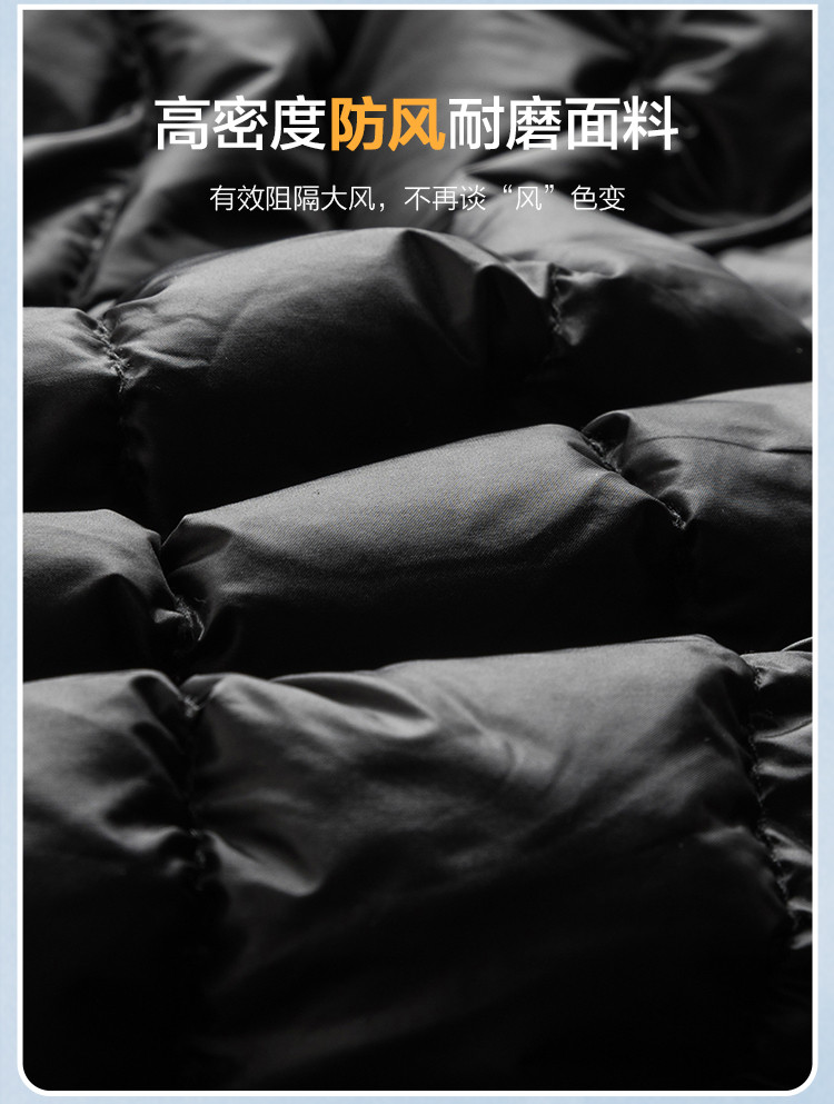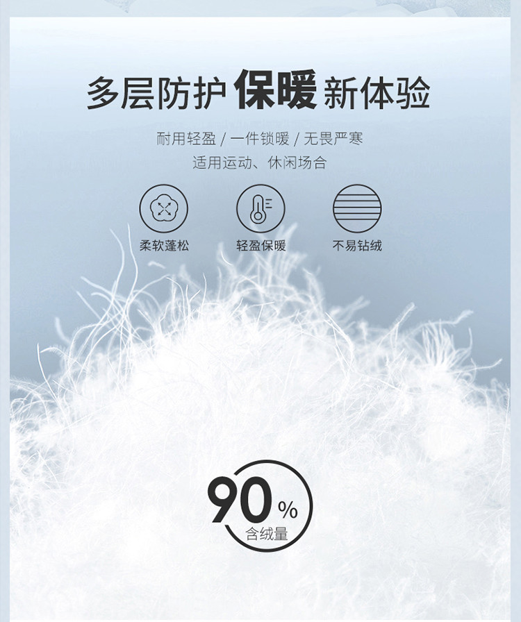面料:100%聚酯纤维 里料:100%聚酯纤维 填充物:白鸭绒 (含绒量90%)
