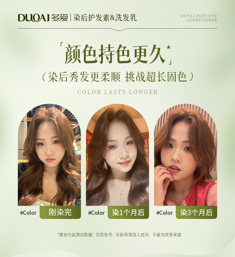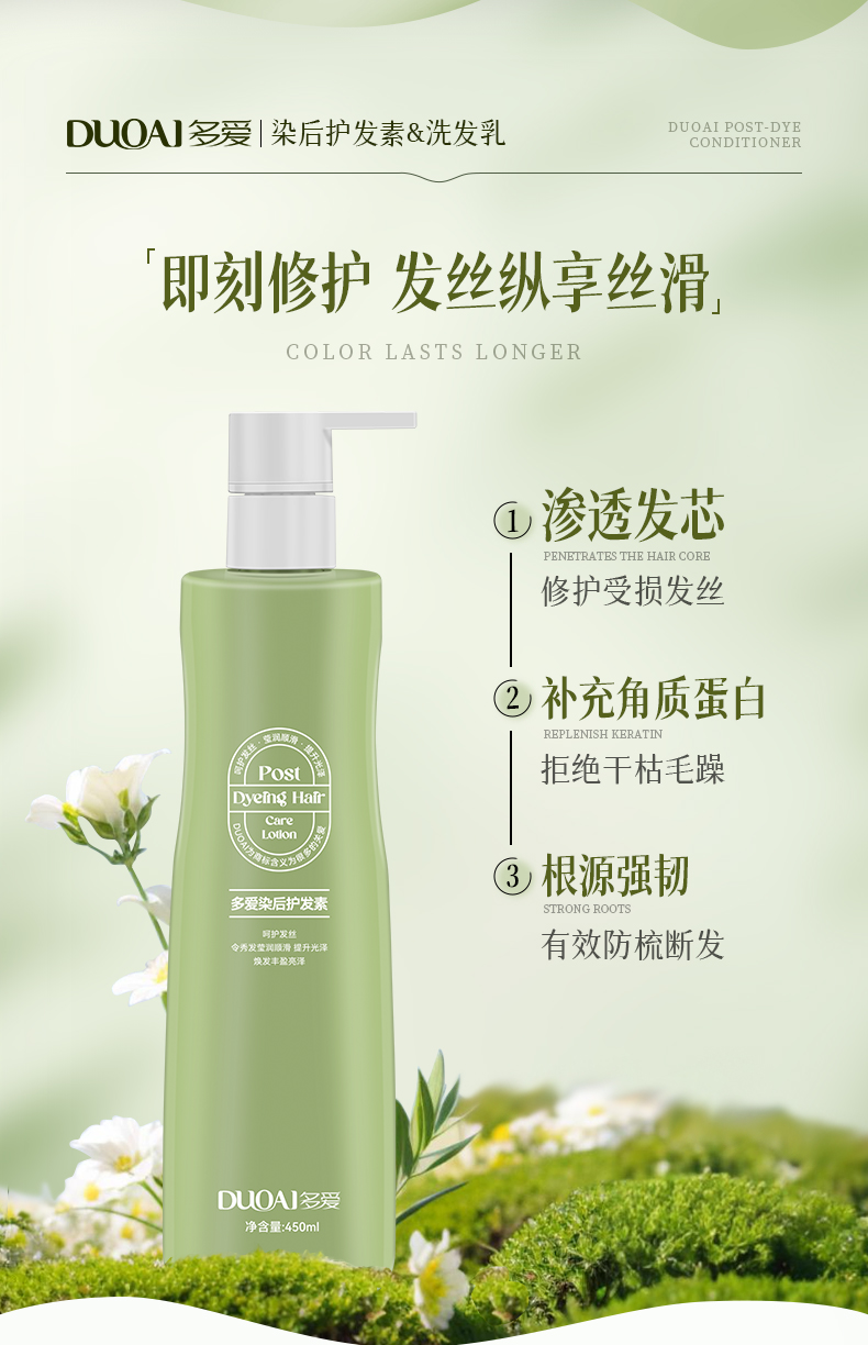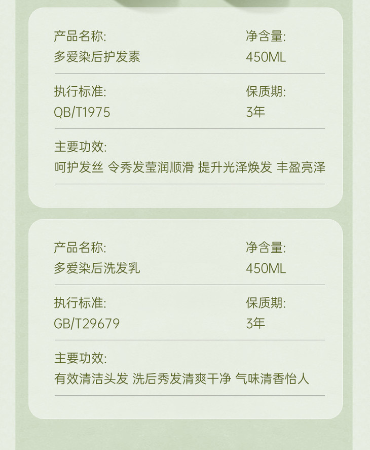 【日用洗护 | 多爱染后洗护套装】洗发水内含进口维生素原B5,建立发色保护屏障,减缓色素流失,起泡丰富温和清洁;护发素八种植物萃取成分,养护头皮,提升头发光泽焕发,丰盈亮泽。
