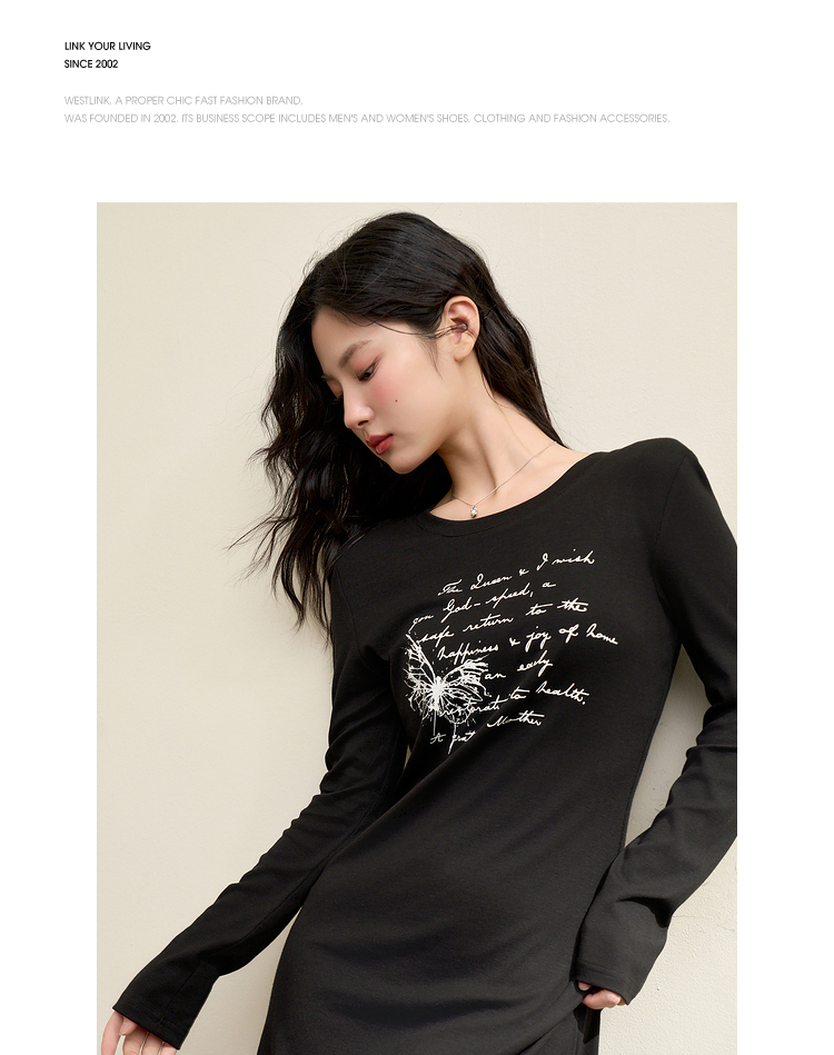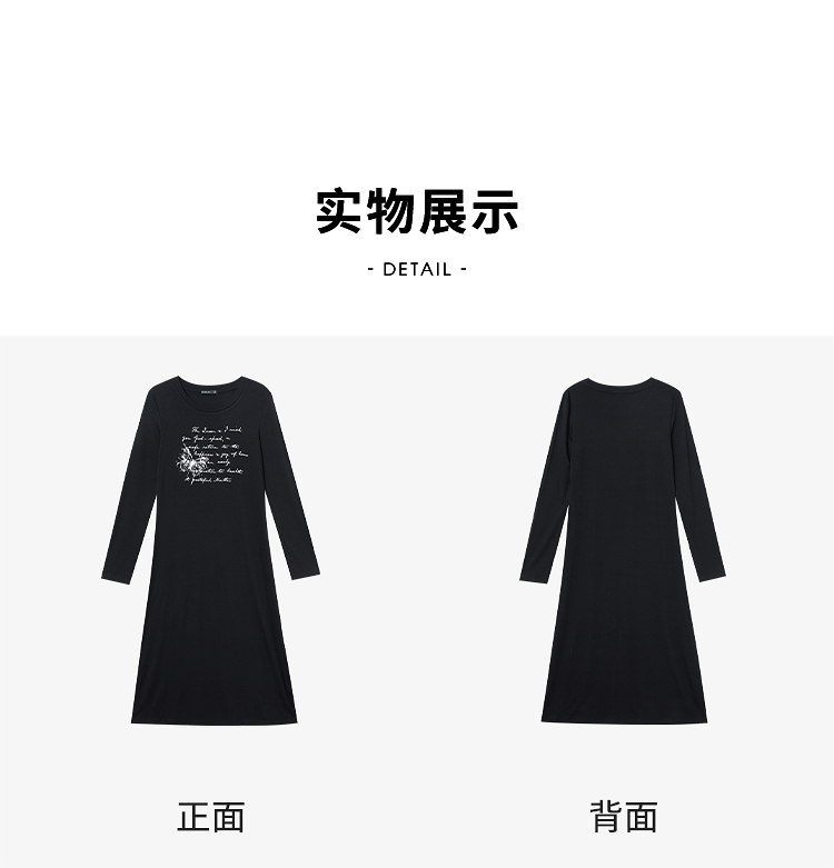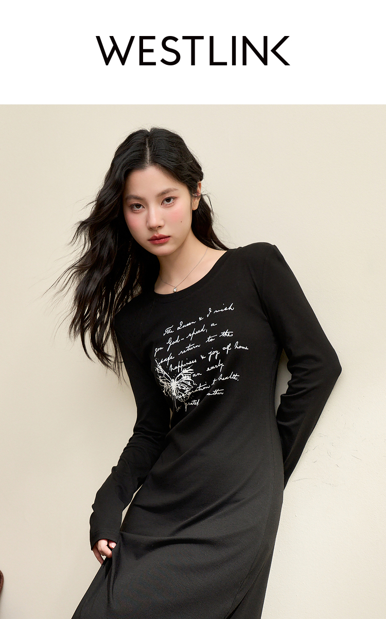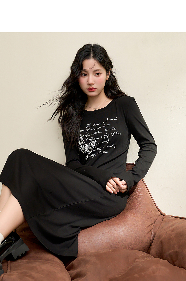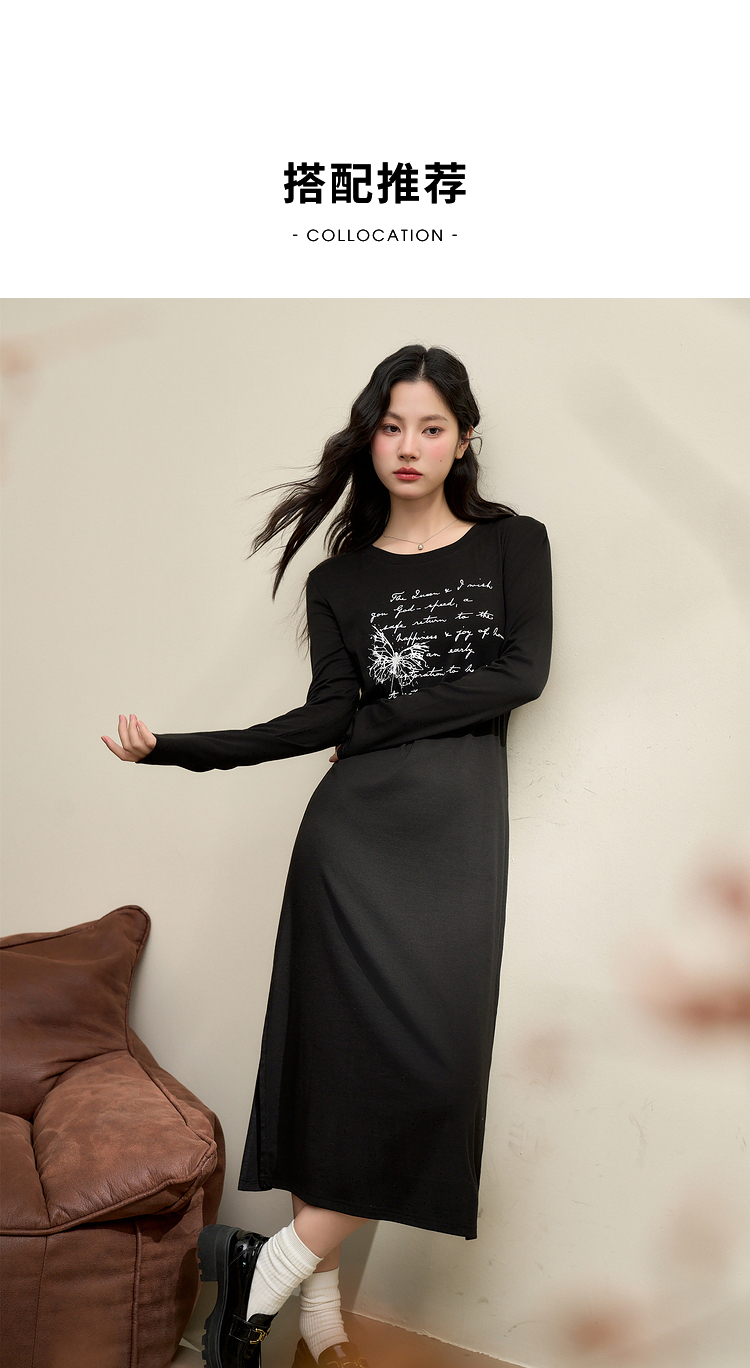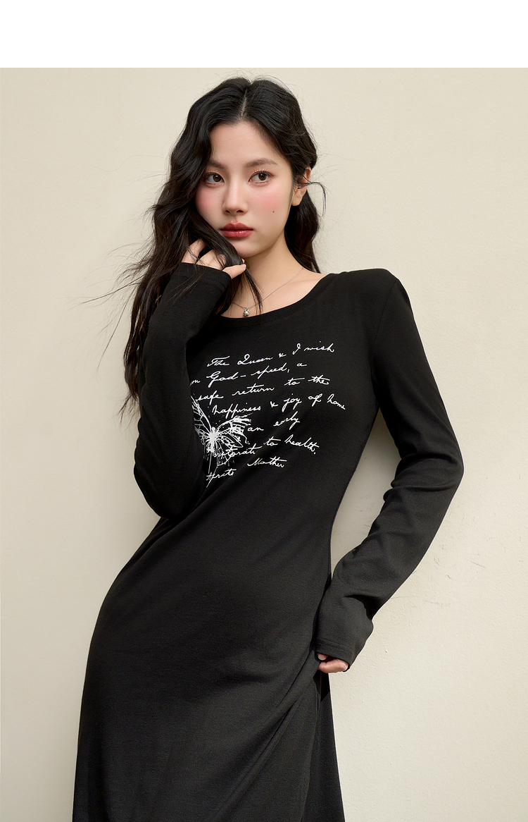 复古字母印花针织长袖连衣裙女早春中长款修身T恤裙V3442366