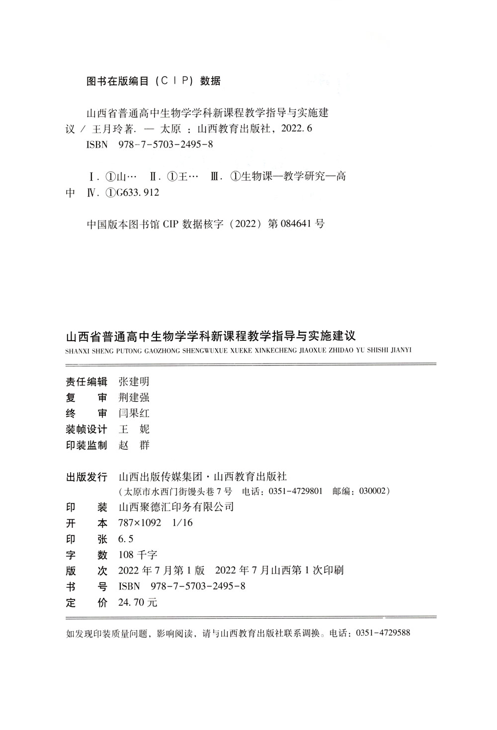 正版 山西省普通高中生物学学科新课程教学指导与实施建议 王月玲著 山西教育出版社出版