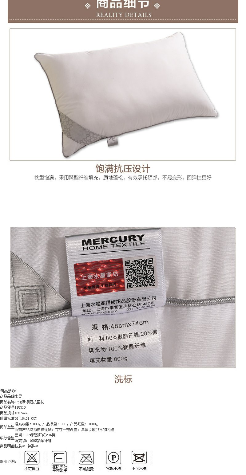 水星家纺 床上用品成人睡眠学生枕头枕芯DH沁新净醛抗菌枕 DH沁新净醛抗菌枕 通用 48*74cm