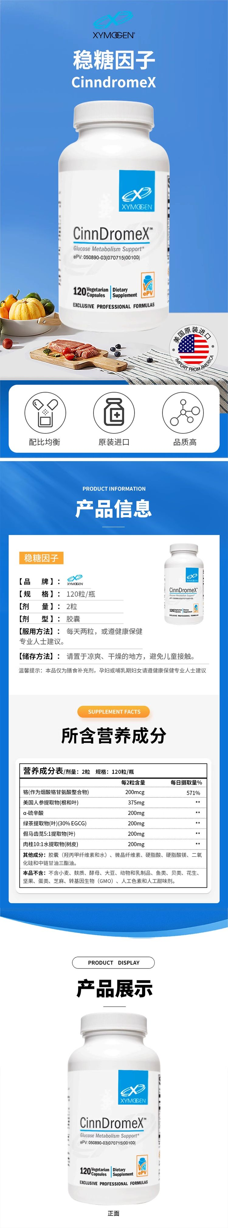 【稳糖因子胶囊】CinnDromeX 120粒 支持健康血糖代谢 支持血脂健康 胰岛素敏感性 硫辛酸+肉桂+铬 赛默金Xymogen