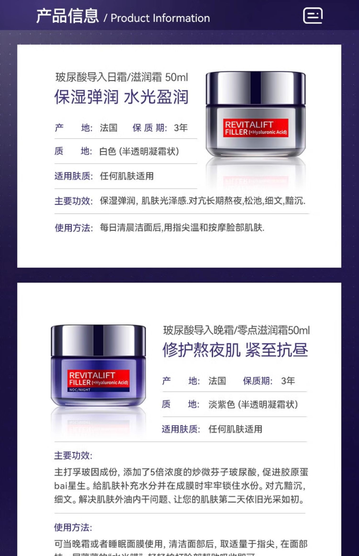 【保税仓】欧莱雅复颜玻尿酸零点晚霜50ml/瓶