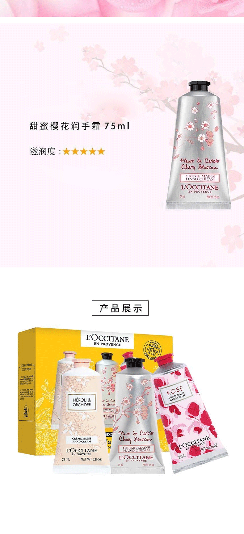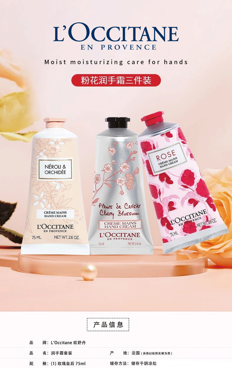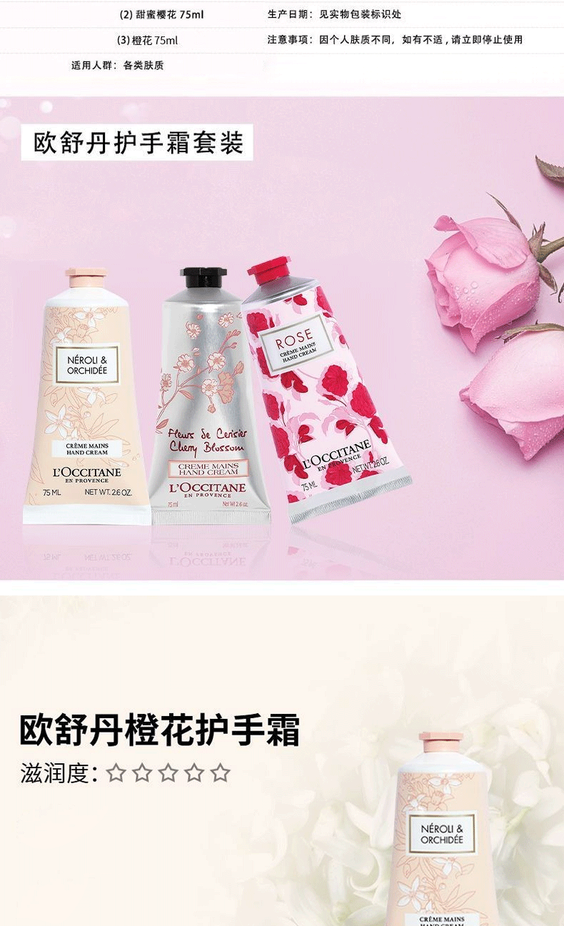 L'OCCITANE/欧舒丹护手霜三件套 75ML*3支(橙花75ML+樱花75ML+玫瑰75ML )一般贸易