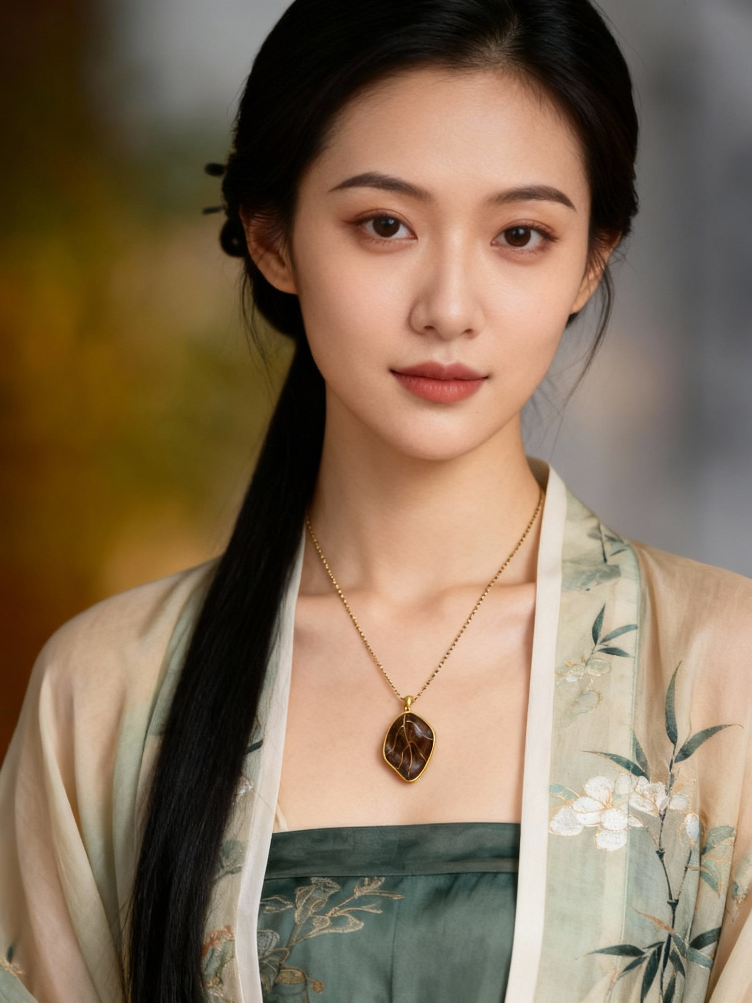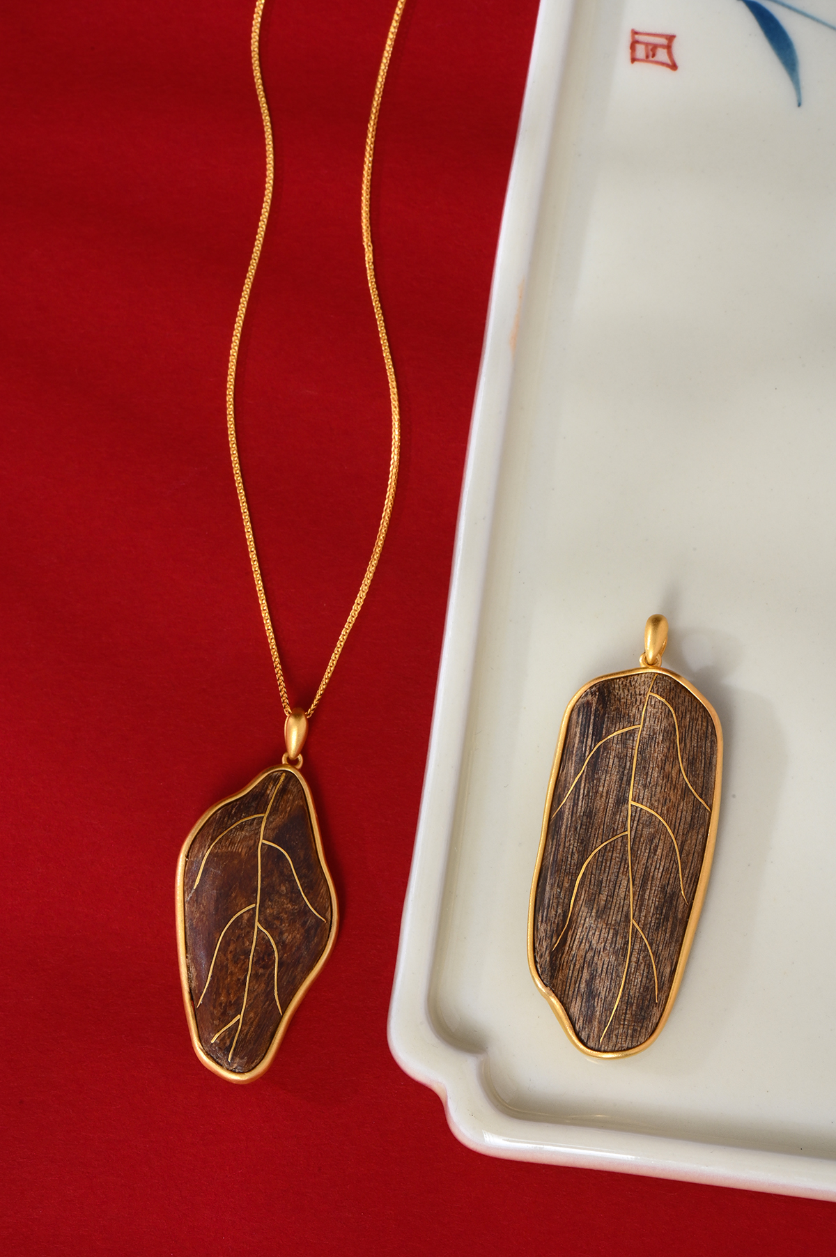 吊坠的不规则树叶形状呼应了“师法自然”的东方美学,为整体精致的造型增添了一抹拙朴与天然趣味,避免过于匠气。