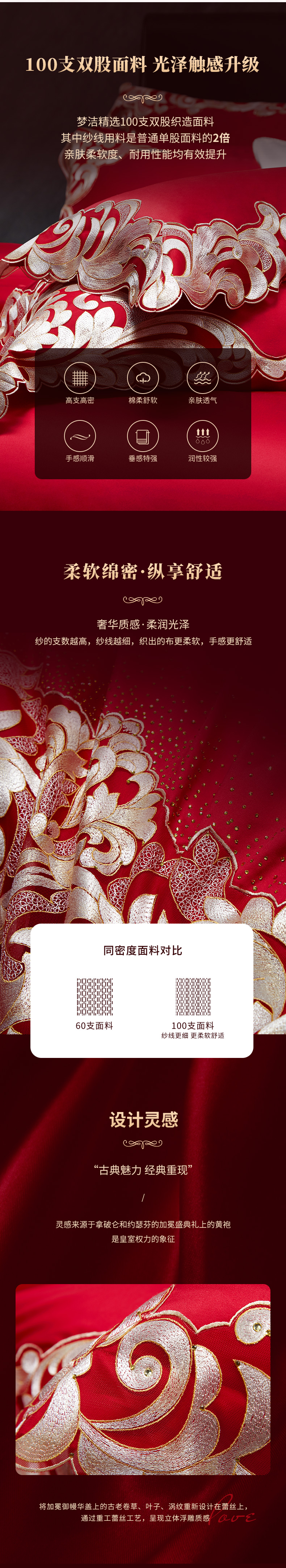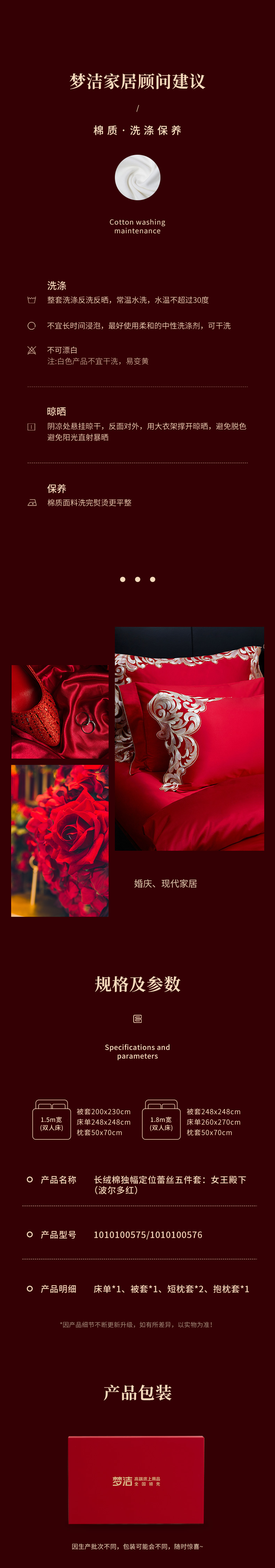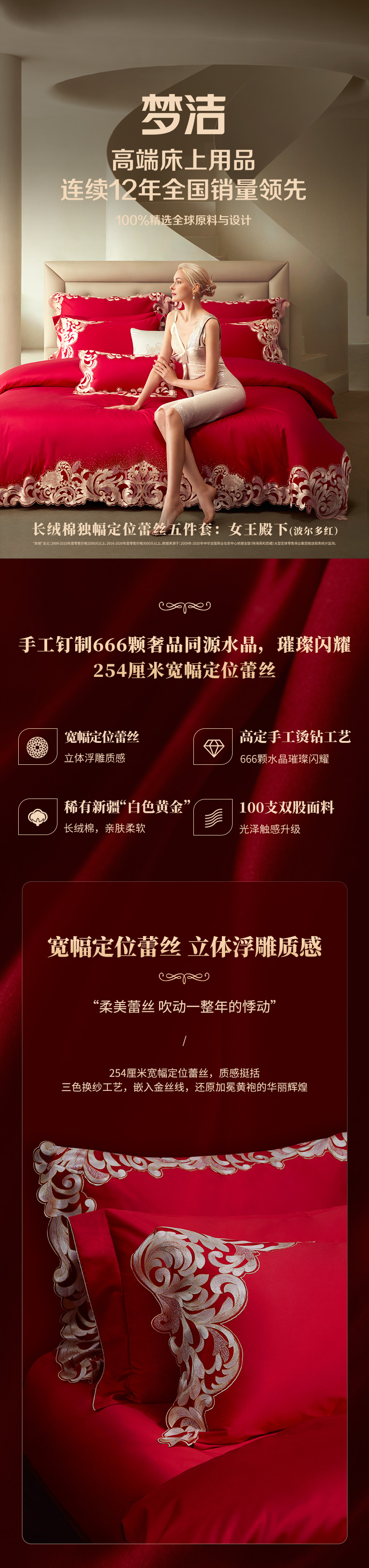 梦洁立体浮雕质感 长绒棉独幅定位蕾丝五件套 :女王殿下(波尔多红)