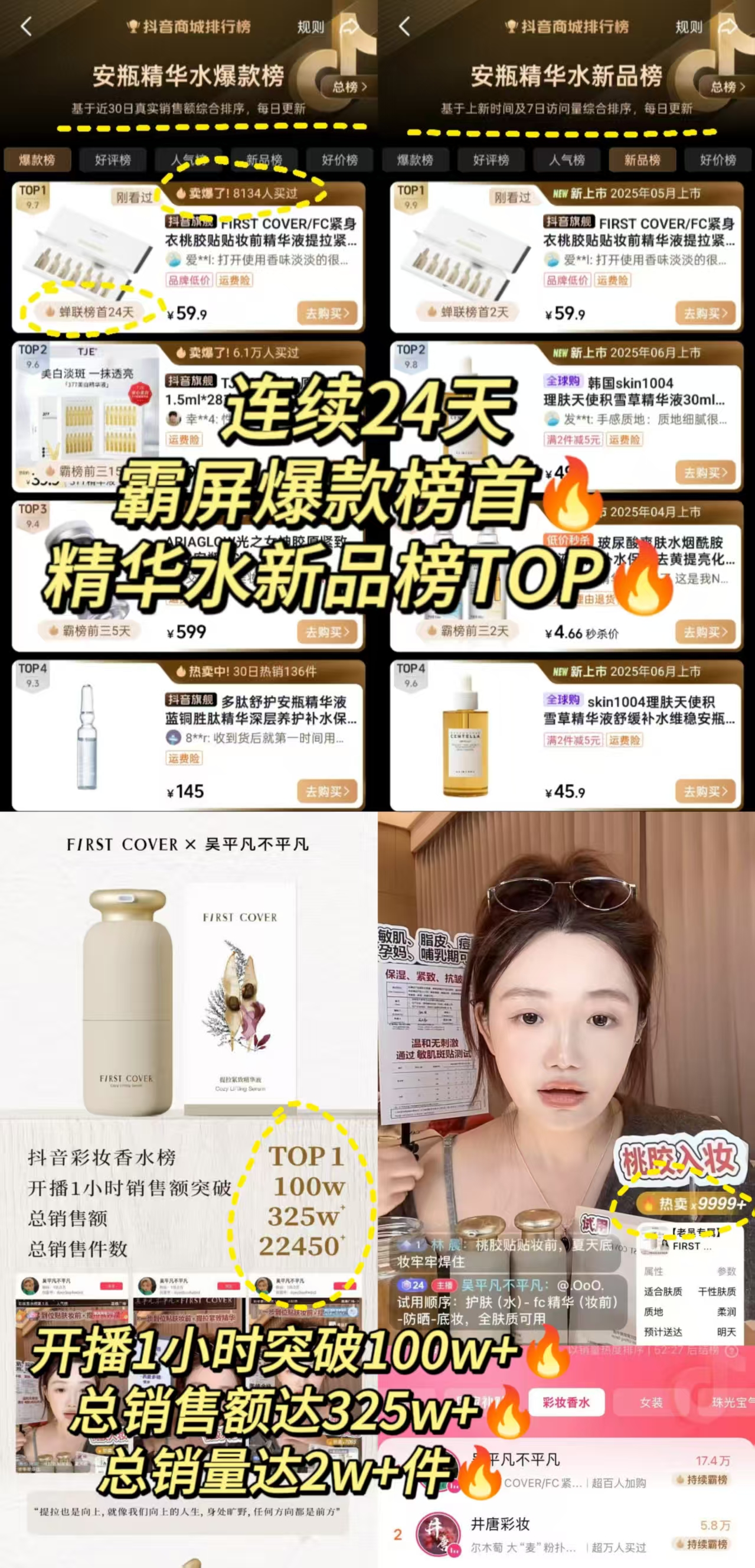 更是接连登上抖音商城安瓶精华水新品榜和爆款榜,甚至蝉联榜首24天!