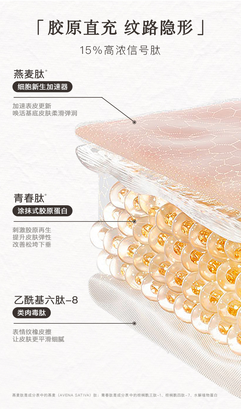 里面15%的复合信号肽,就像给肌肤的“健身教练”,能慢慢唤醒肌底的胶原蛋白,
