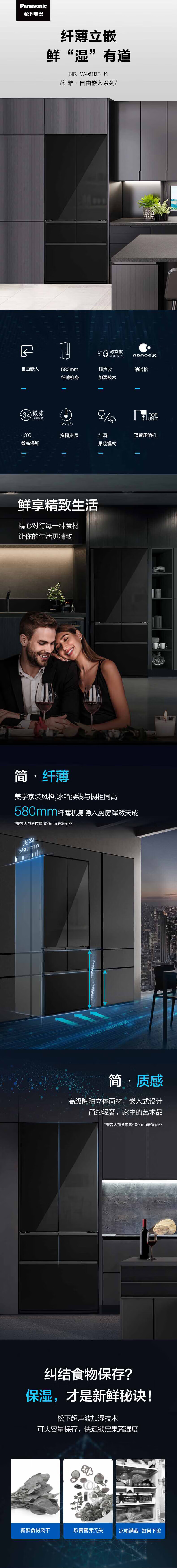 松下(Panasonic)嵌入式冰箱超薄453升自动制冰多门电冰箱纳诺怡x净味除菌 玻璃门NR-W461BF-K 玛瑙黑