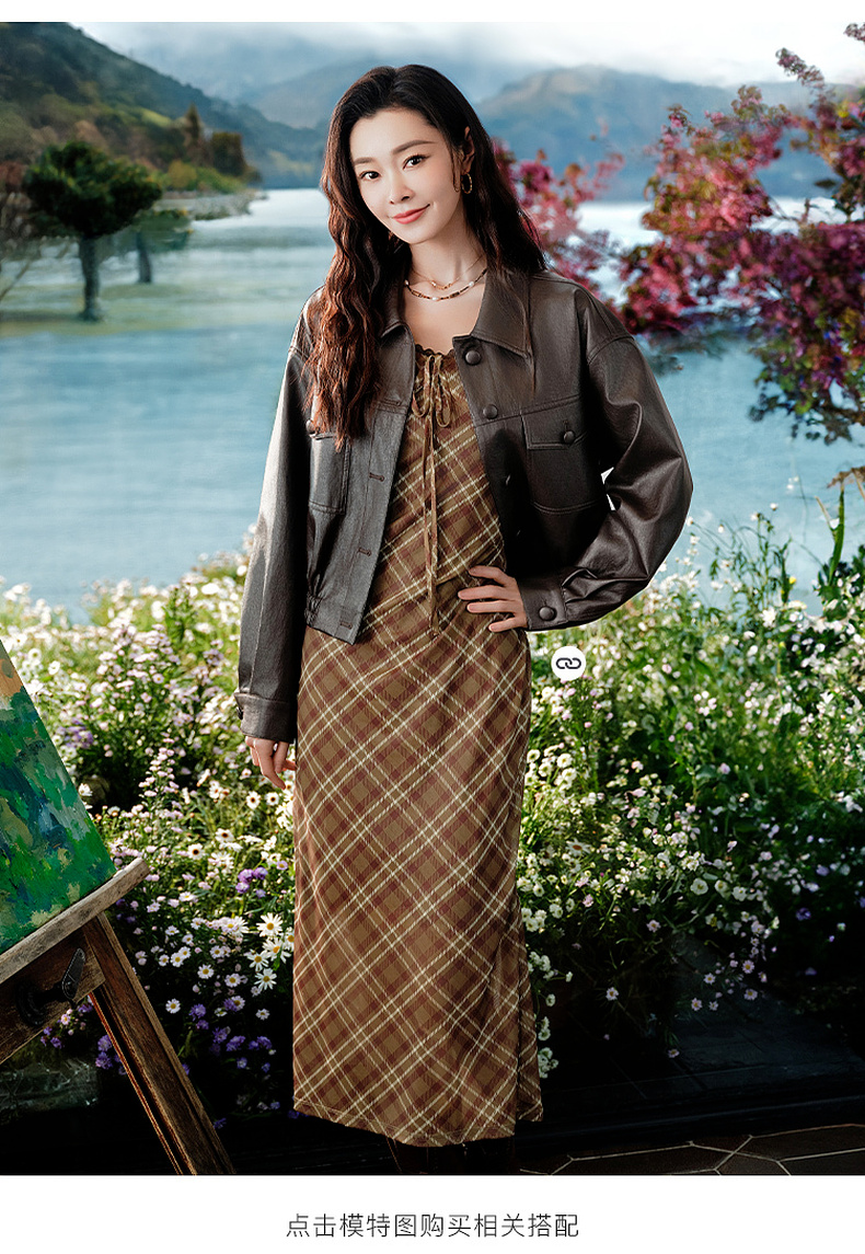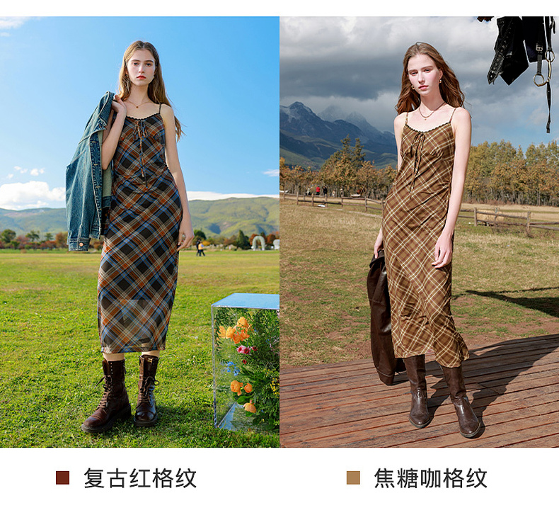 三彩2025秋季新款格纹网纱吊带裙无袖连衣裙系带长裙内搭修身M