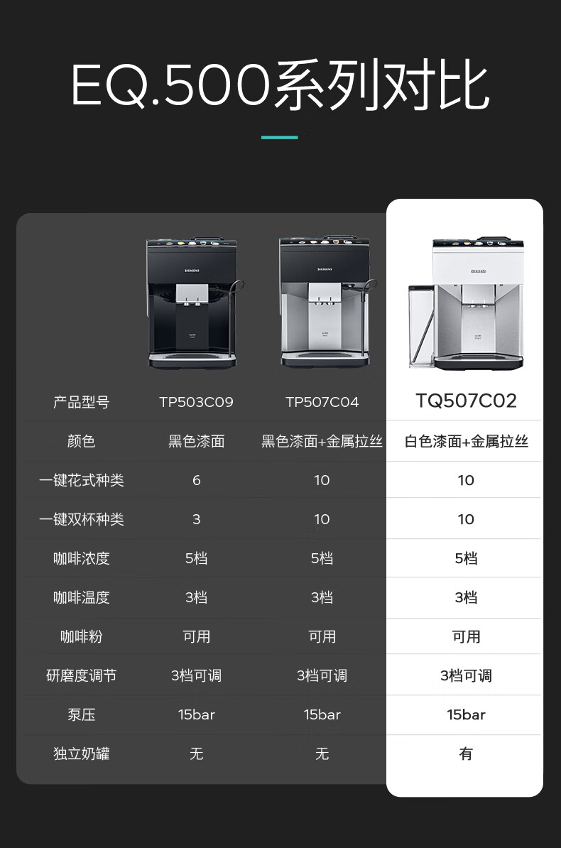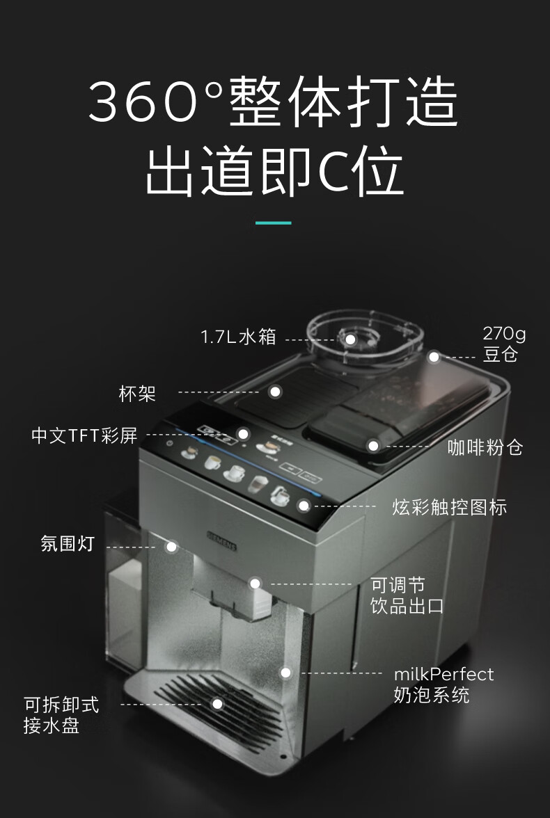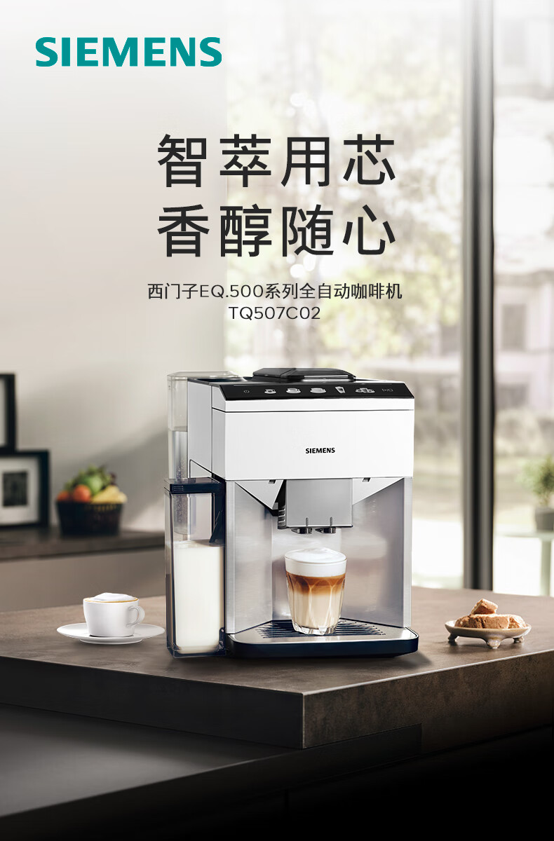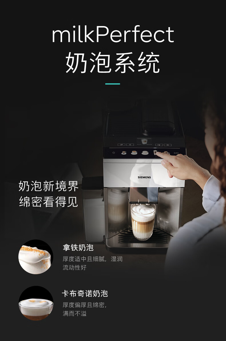 西门子/咖啡机/TQ507C02/西门子全自动咖啡机家用研磨一体机意式磨豆机奶泡机 15Bar泵压欧洲进口陶瓷低温研磨办公月光银
