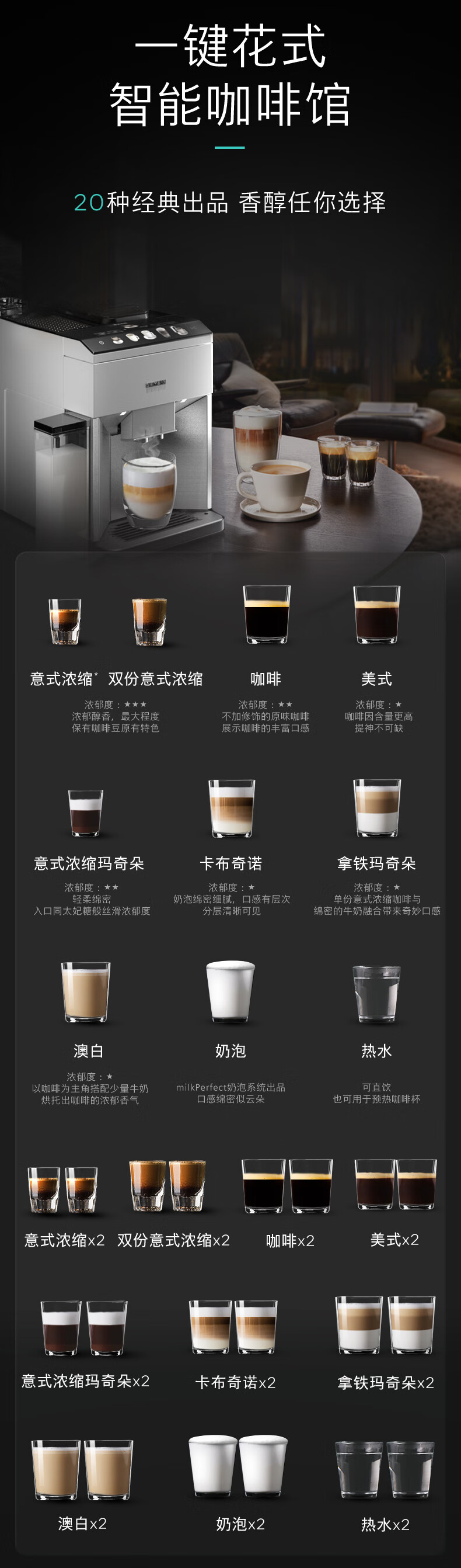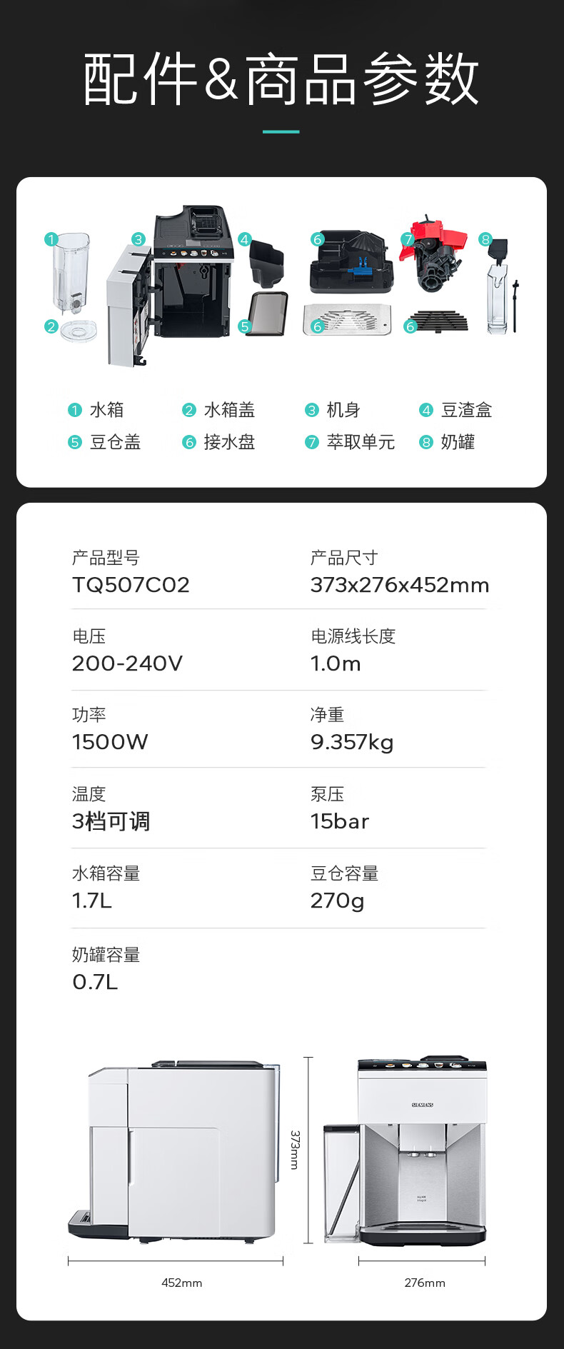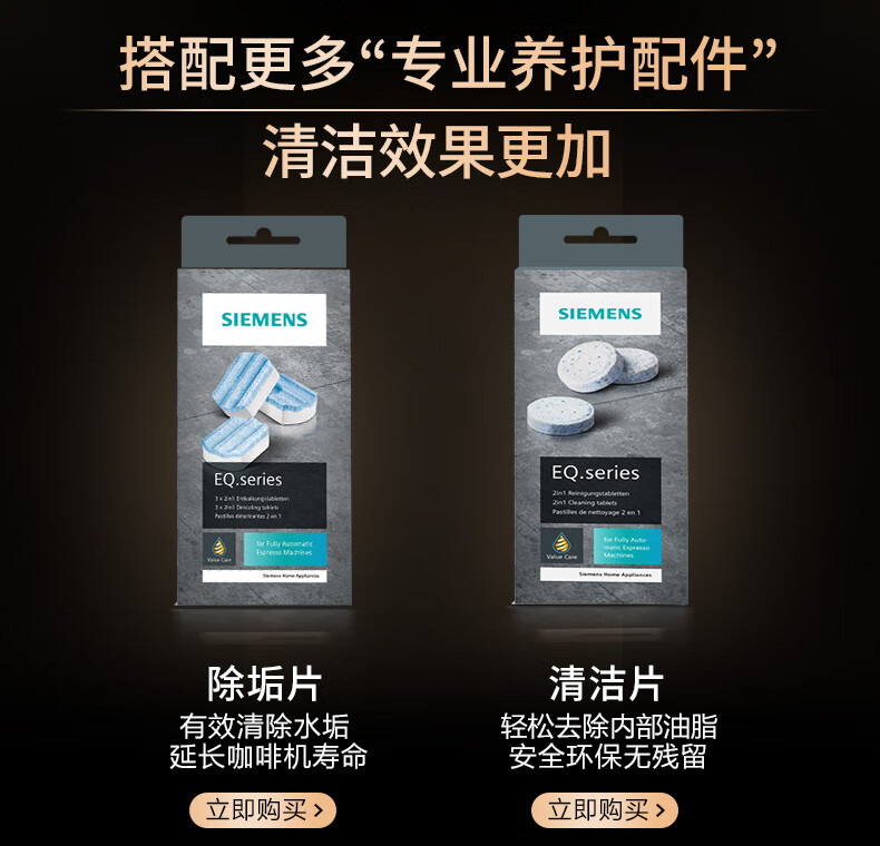 西门子/咖啡机/TQ507C02/西门子全自动咖啡机家用研磨一体机意式磨豆机奶泡机 15Bar泵压欧洲进口陶瓷低温研磨办公月光银