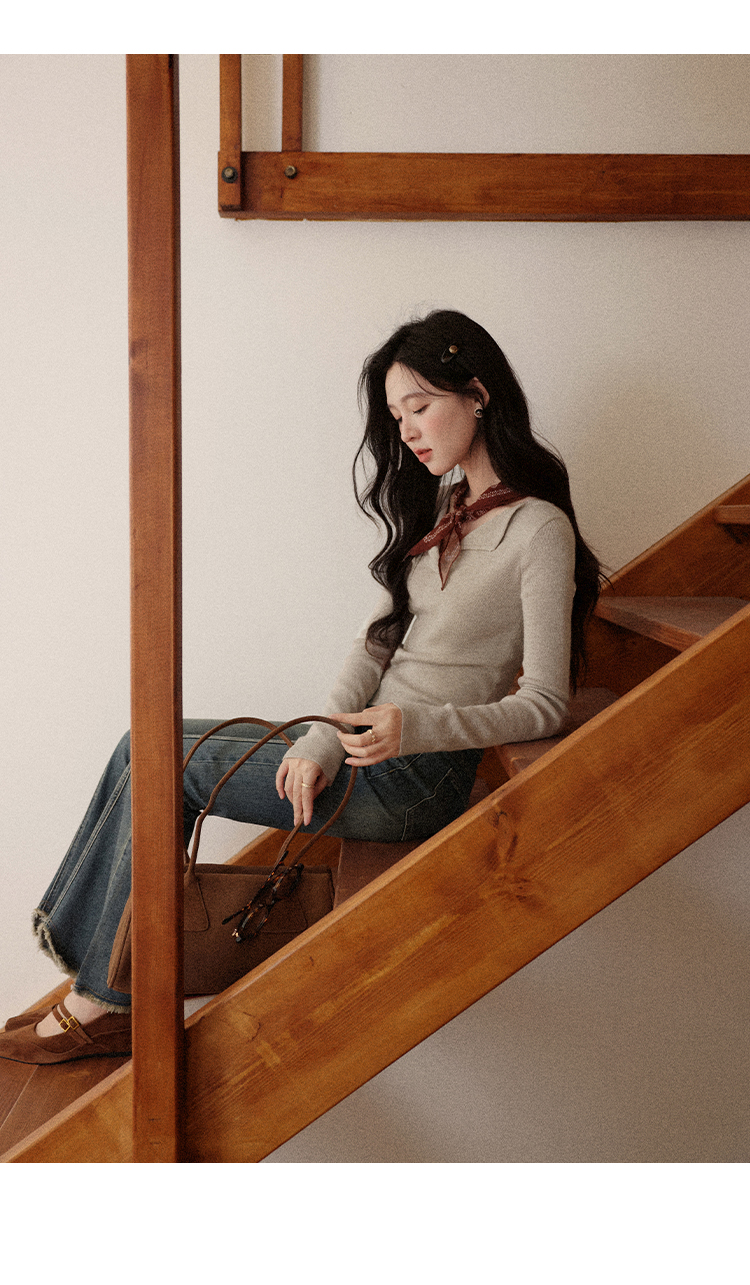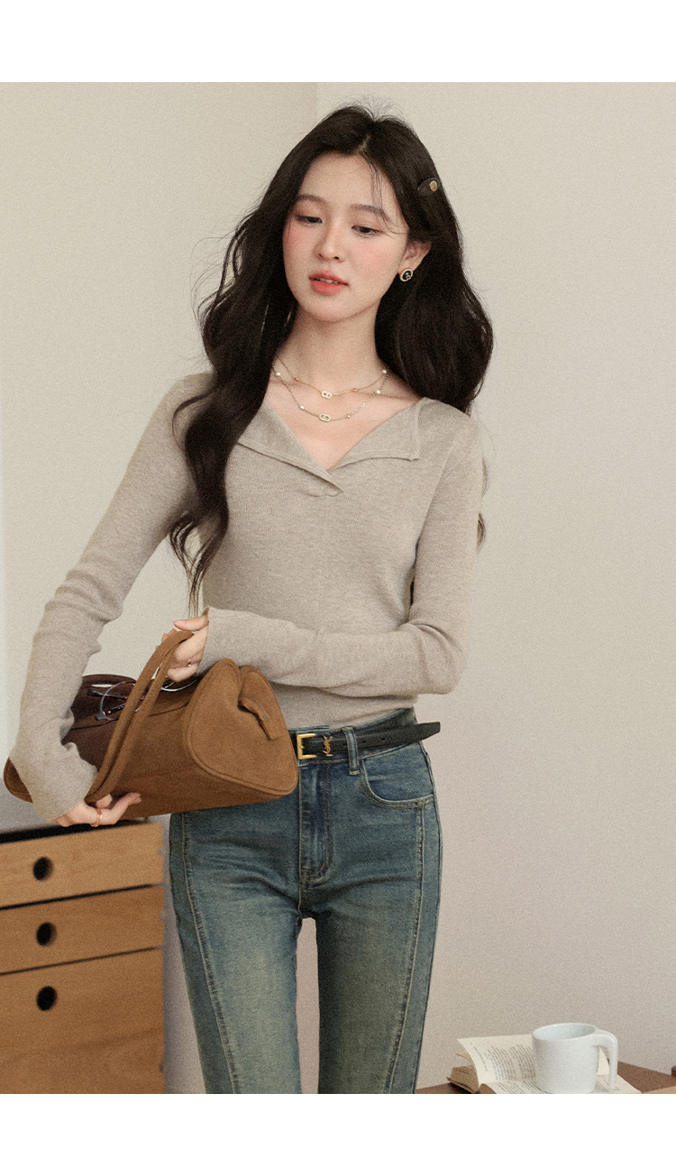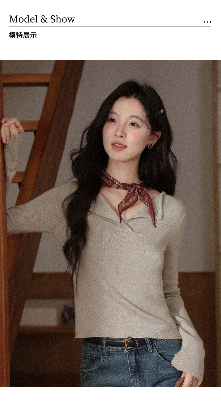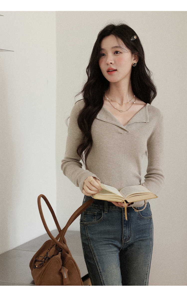 鹿向南「蝶吻香肩」法式奶茶咖V领长袖针织衫女初秋修身显瘦上衣