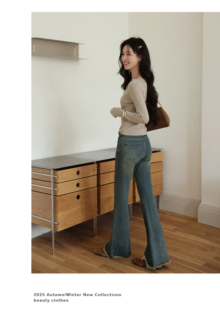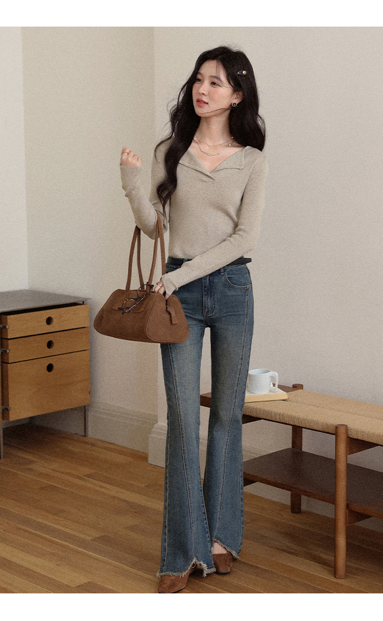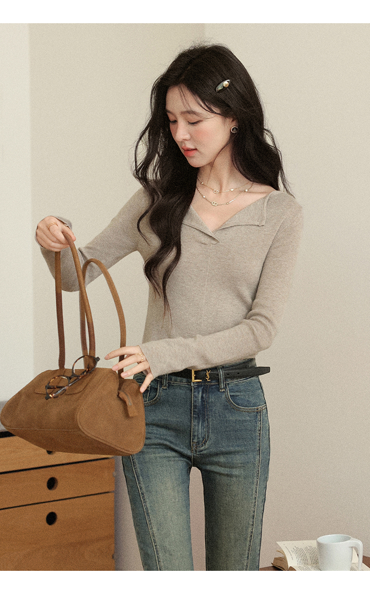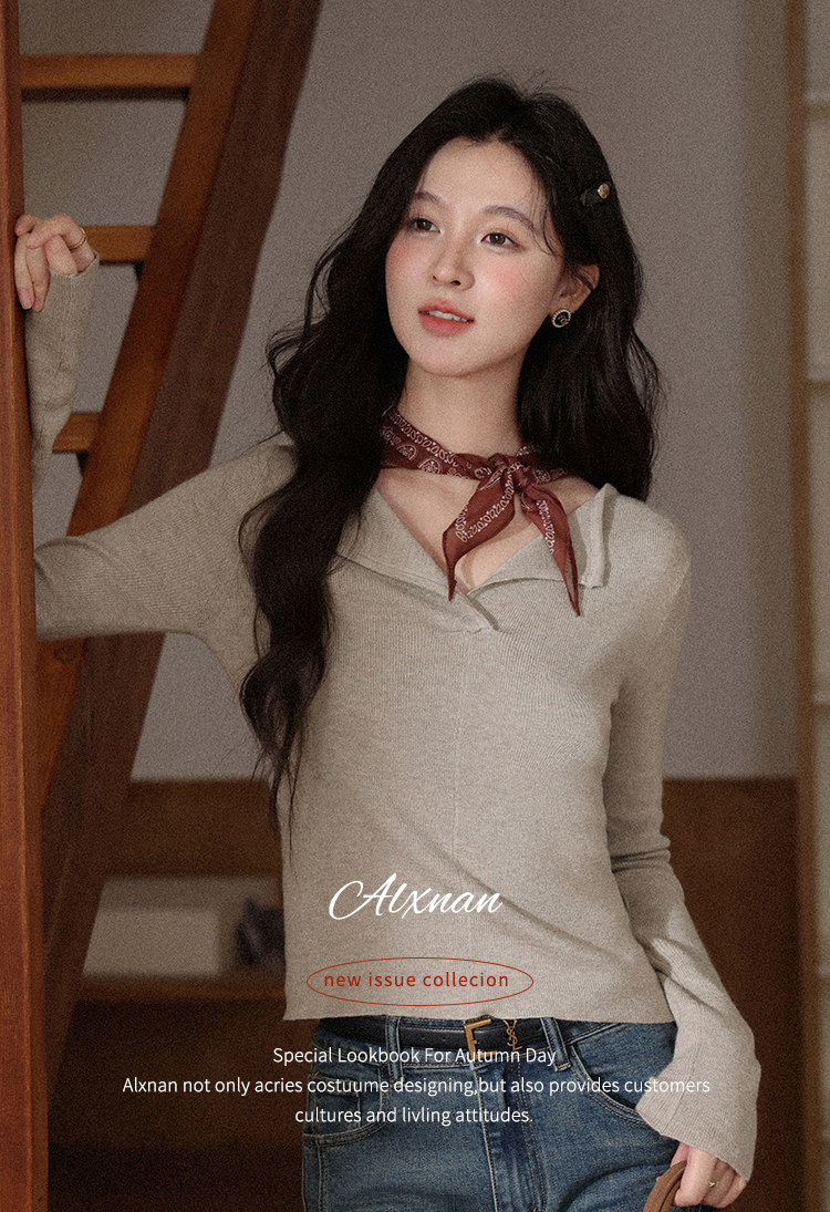 鹿向南「蝶吻香肩」法式奶茶咖V领长袖针织衫女初秋修身显瘦上衣