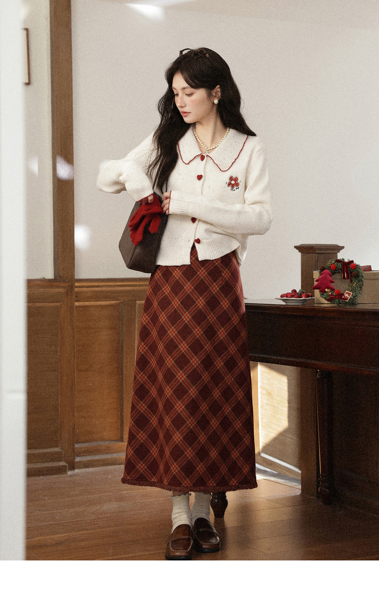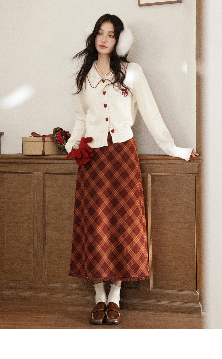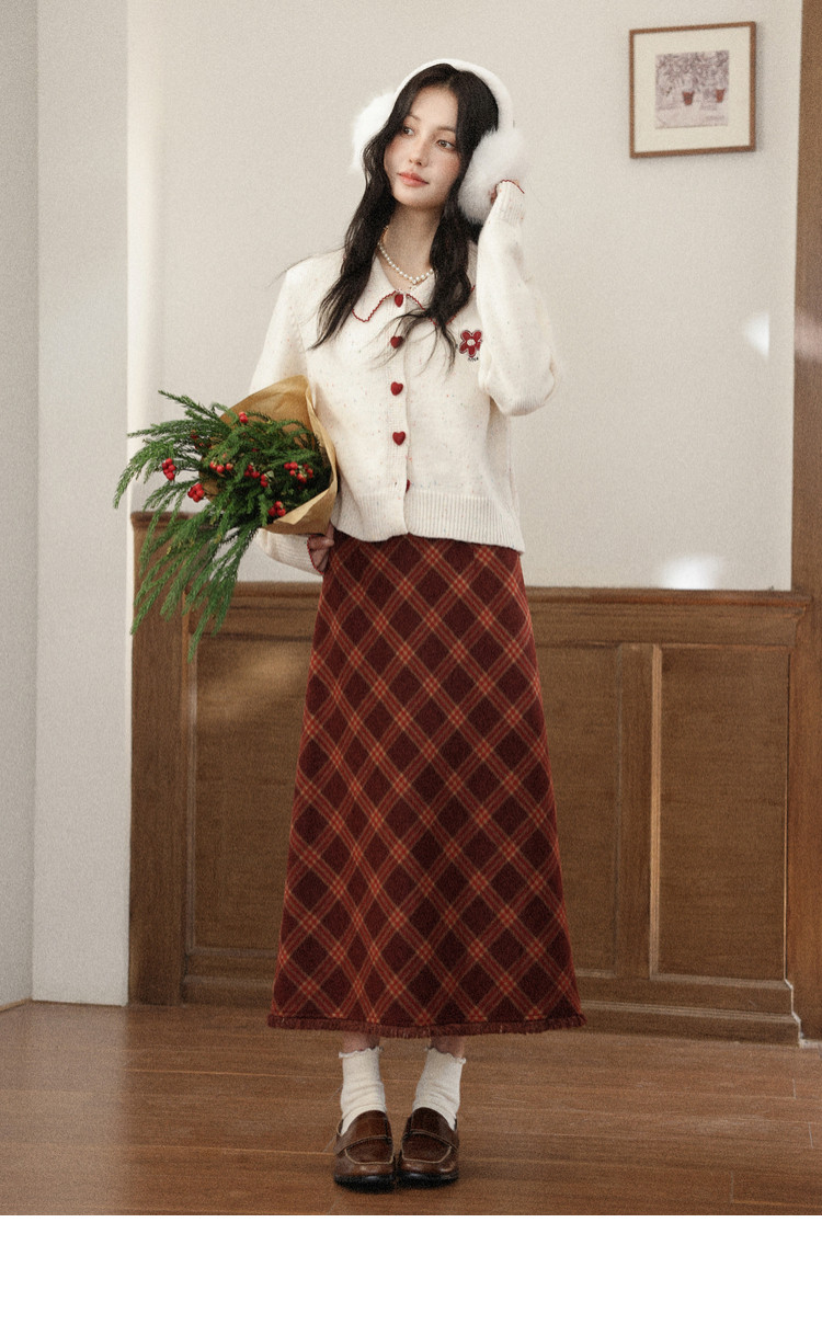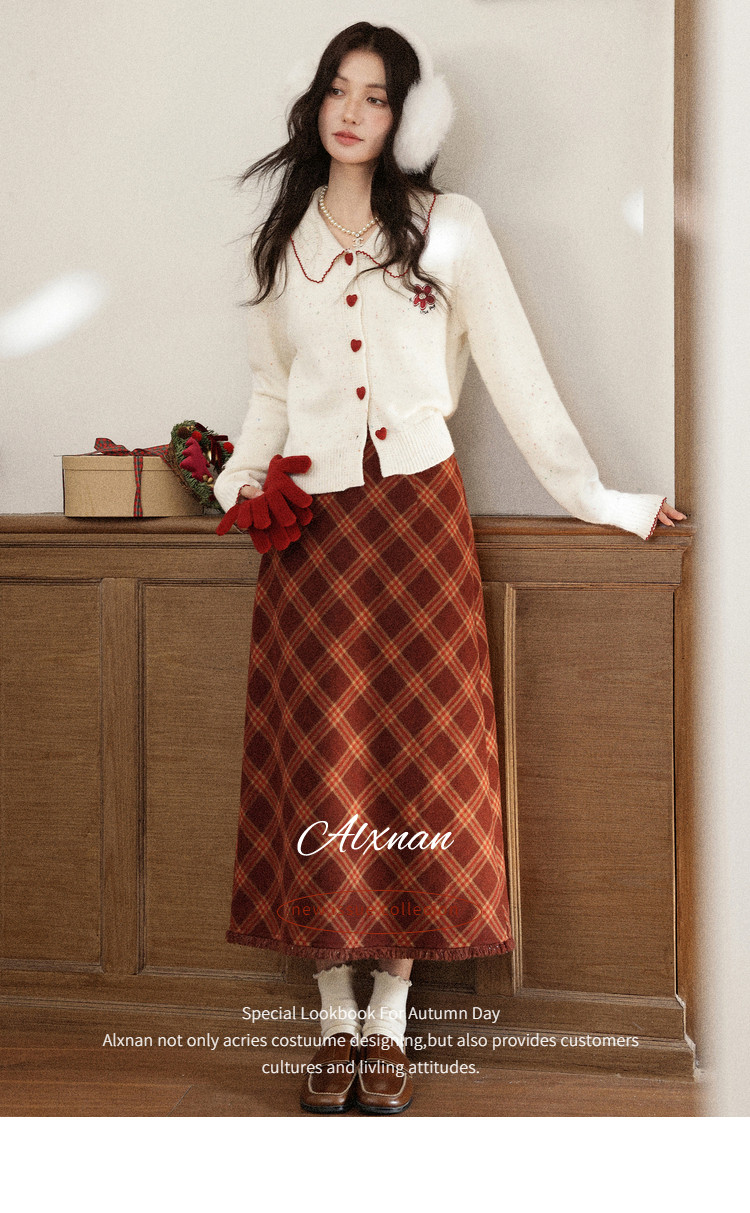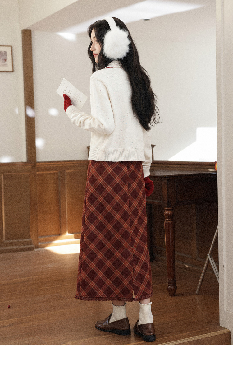 鹿向南「红莓果酱」杏色针织毛衣复古显瘦格纹半身裙女冬时尚套装