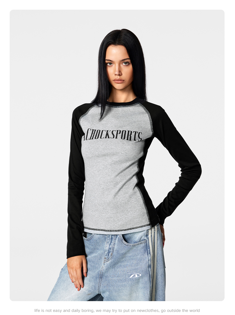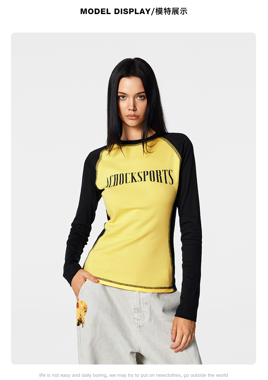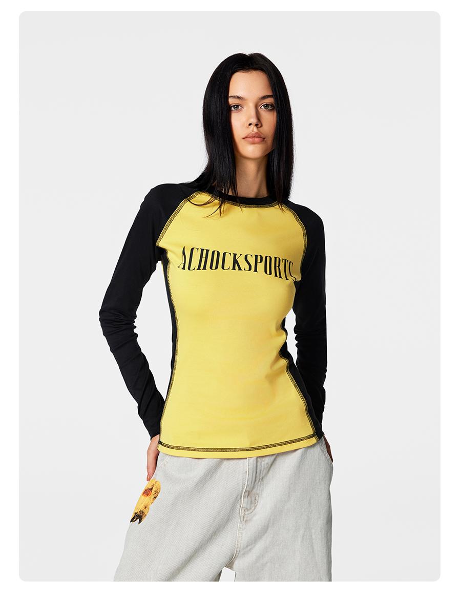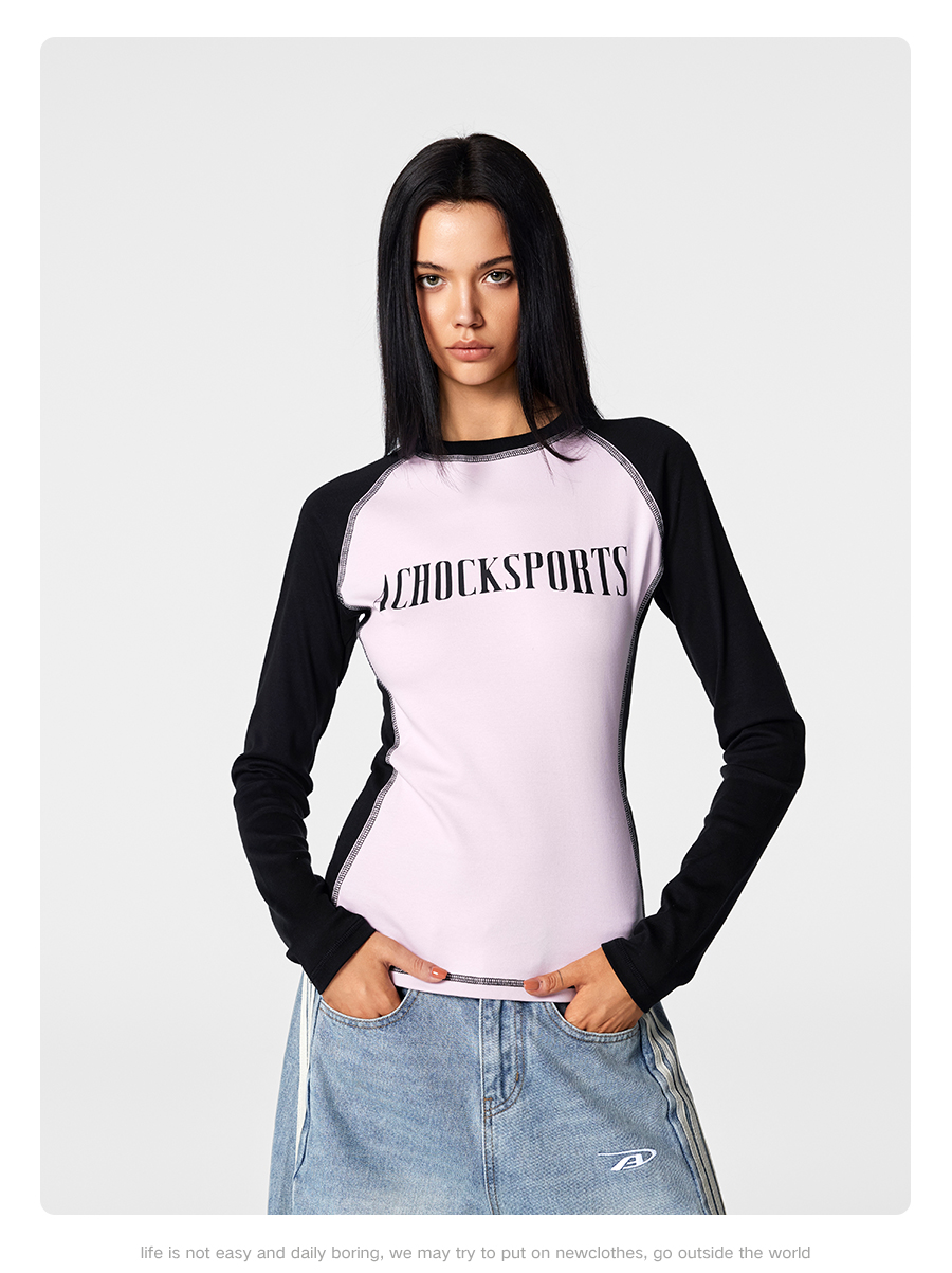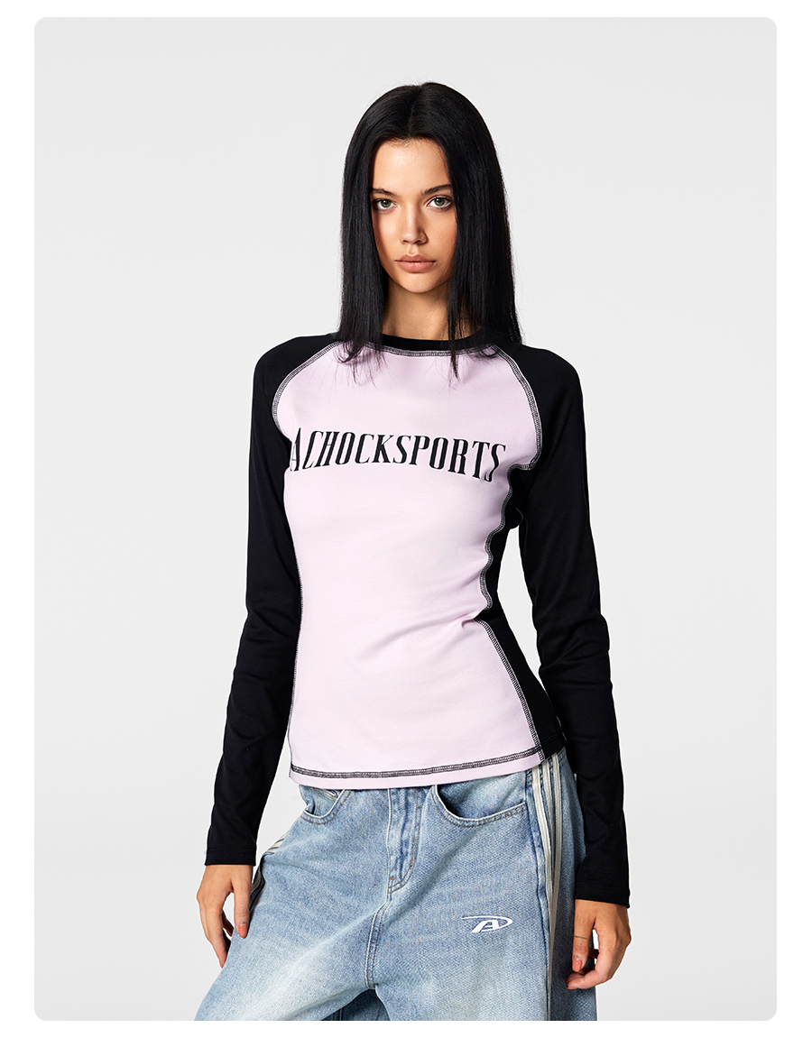【Achock官方店】美式紧身长袖上衣女拼色正肩长袖T恤衫辣妹显瘦
