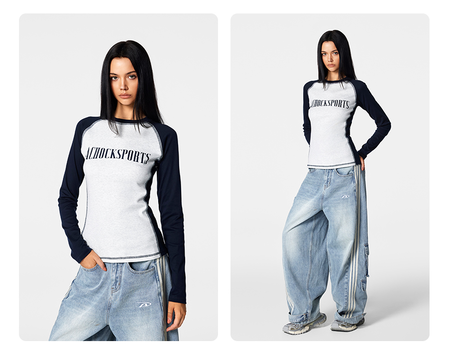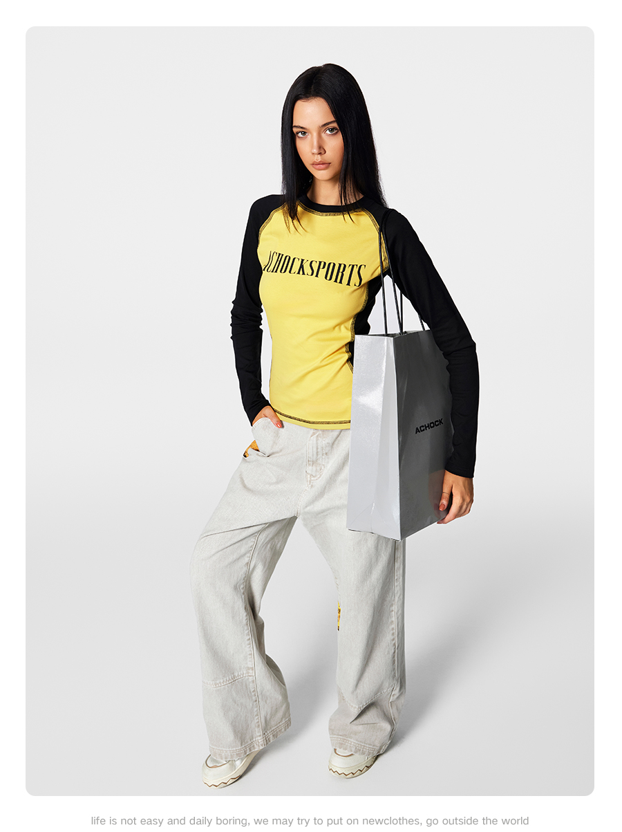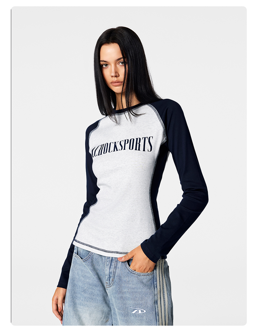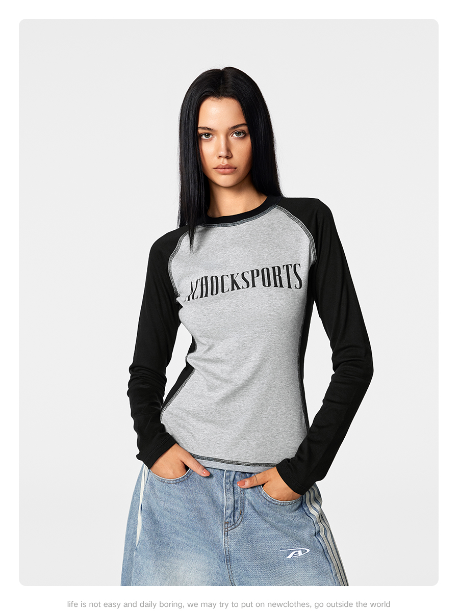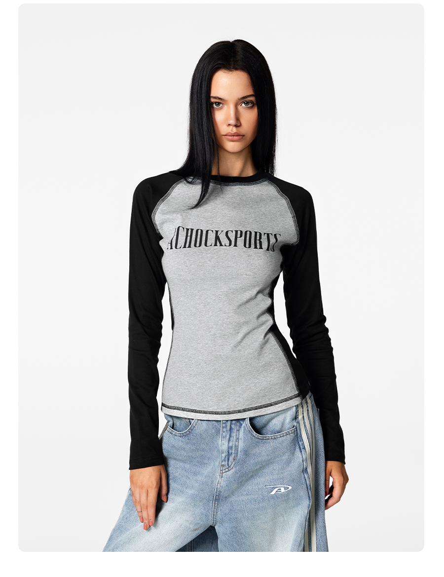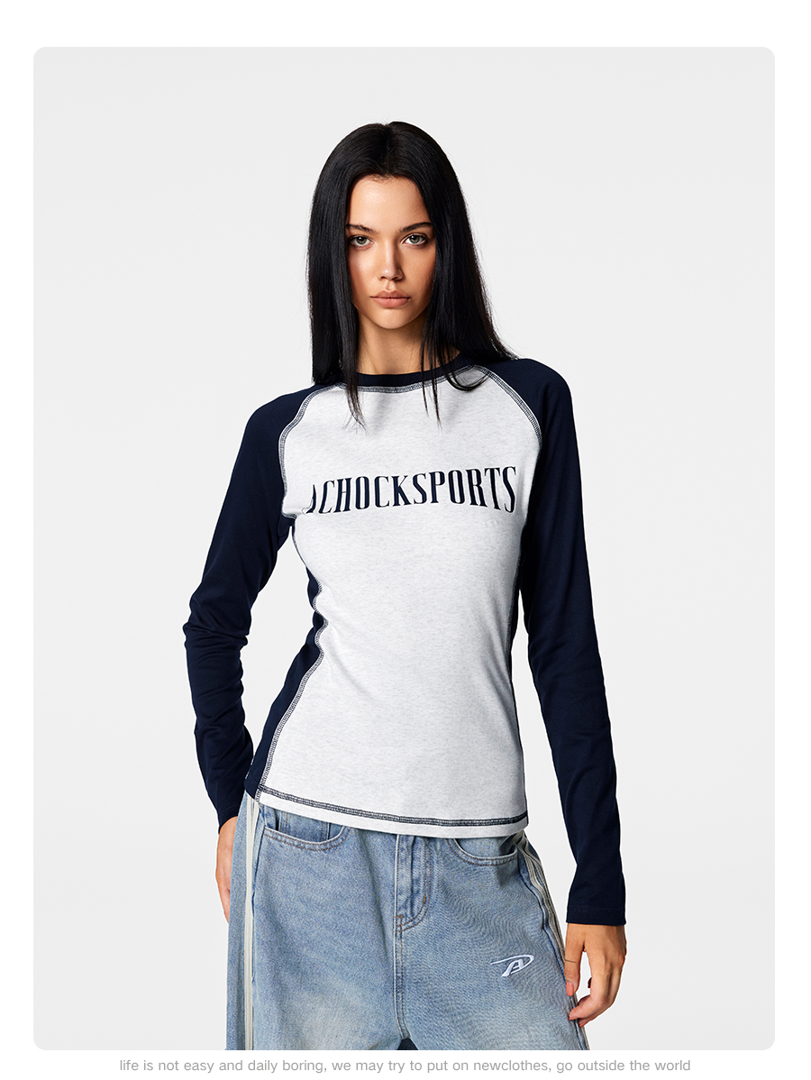 【Achock官方店】美式紧身长袖上衣女拼色正肩长袖T恤衫辣妹显瘦