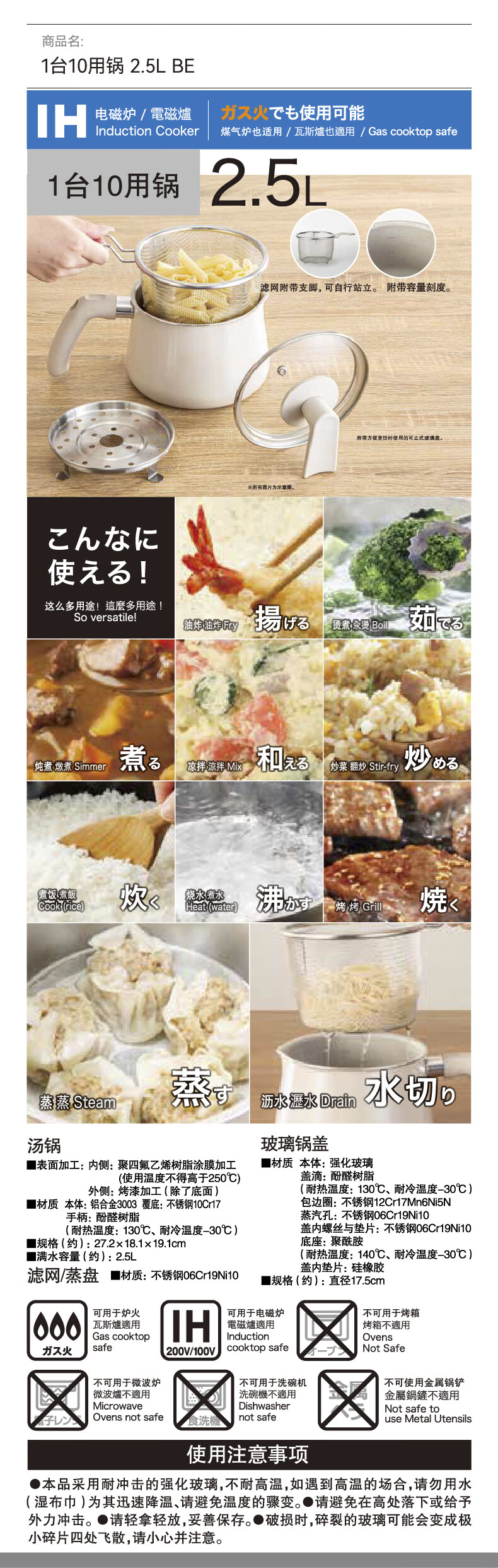 NITORI宜得利家居 大容量烧水壶煮面蒸煎多功能电磁炉兼用1台10用锅