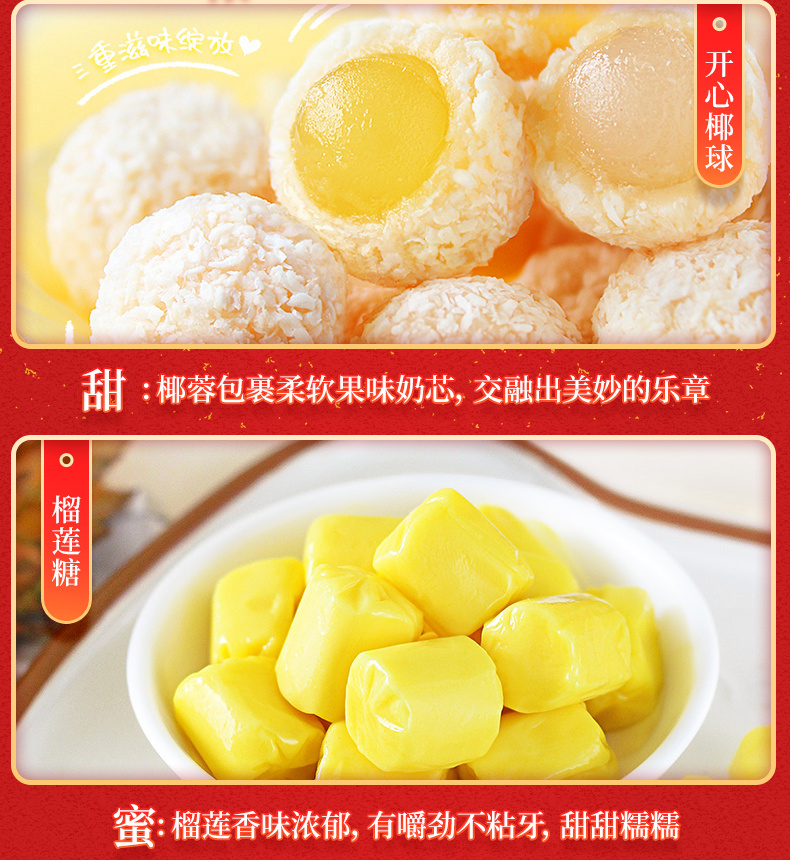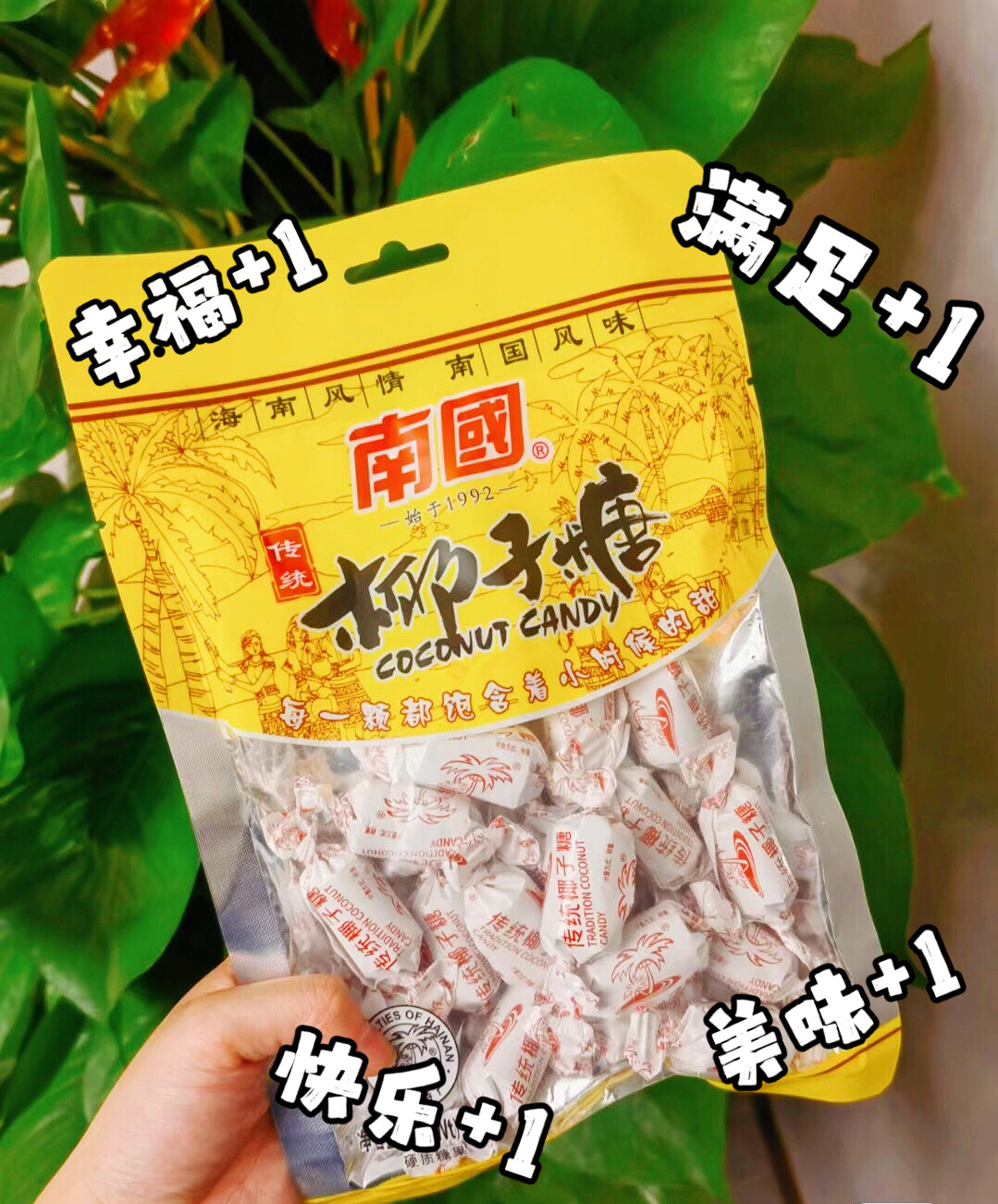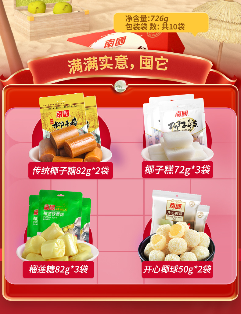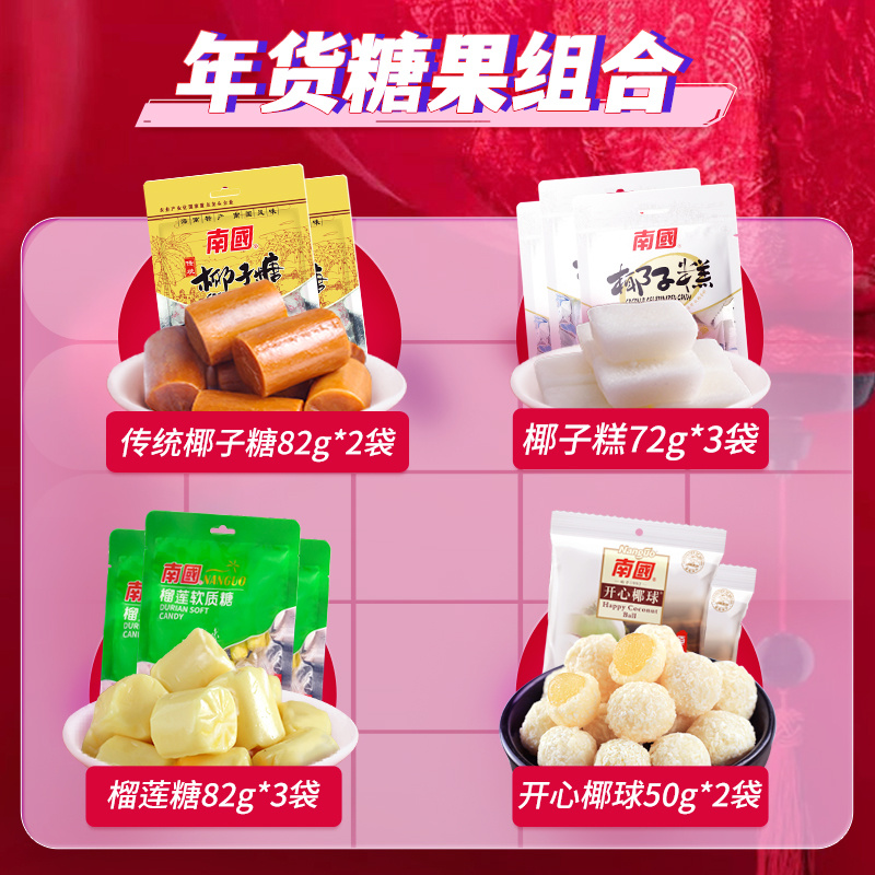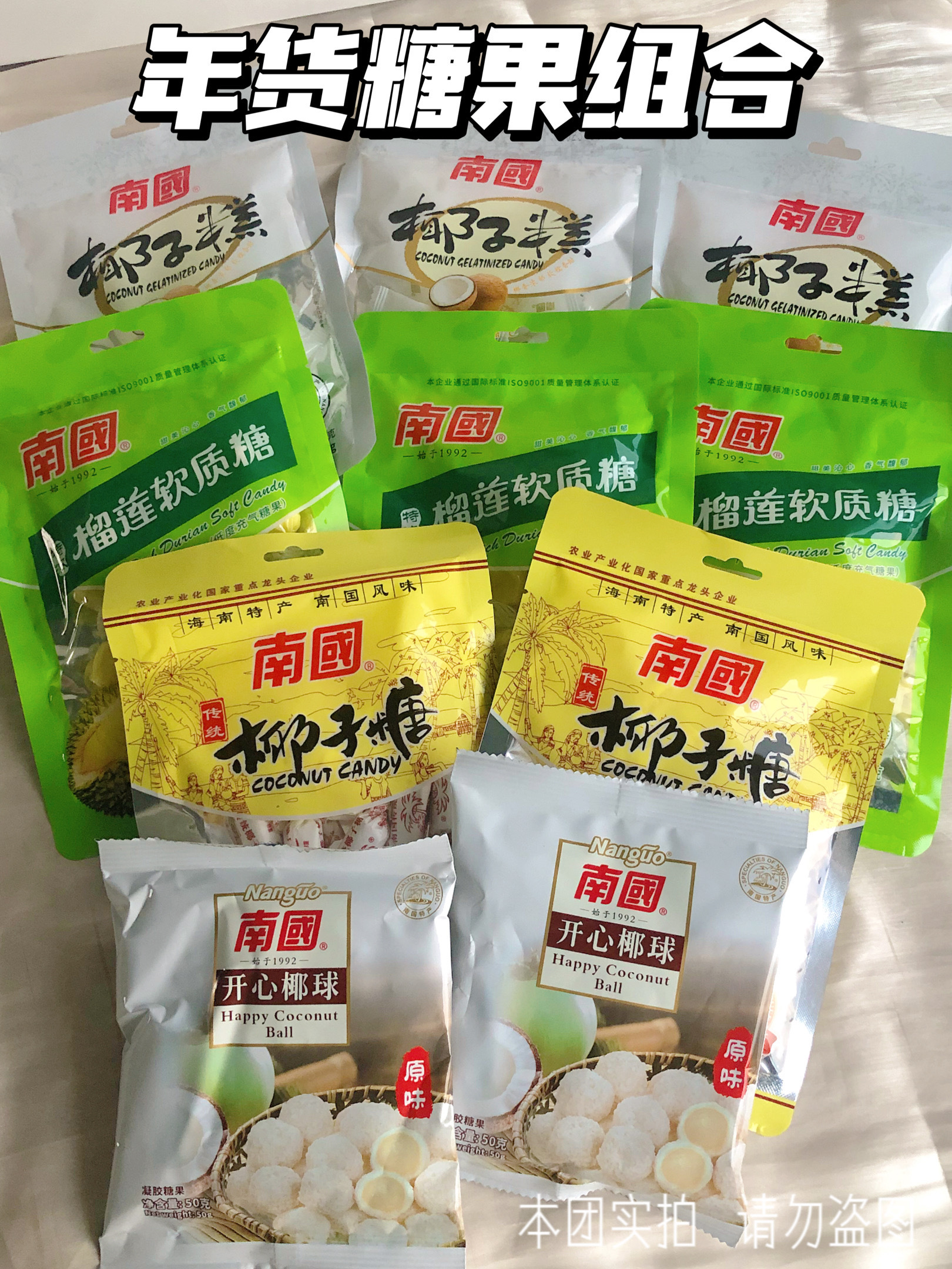 【品牌】南国 【品名】年糖组合726g 【规格】 1、82g传统椰子糖*2袋【新年一口椰香,甜甜蜜蜜】 2、50g开心椰球*2袋【新年开开心心】 3、72g椰子糕*3袋【新年甜甜糯糯】 4、82g榴莲软质糖*3袋【新年快乐“榴‘莲忘返】 【生产日期】近期 【保质期】365天 【发货地】海南仓、广东仓、安徽仓,三仓随机安排 【发货快递】四通一达,邮政、极兔、韵达等,随机安排 【发货时效】48小时 【不发货地区】新疆、西藏、宁夏不发 【售后规则】非质量问题,不支持退换货!